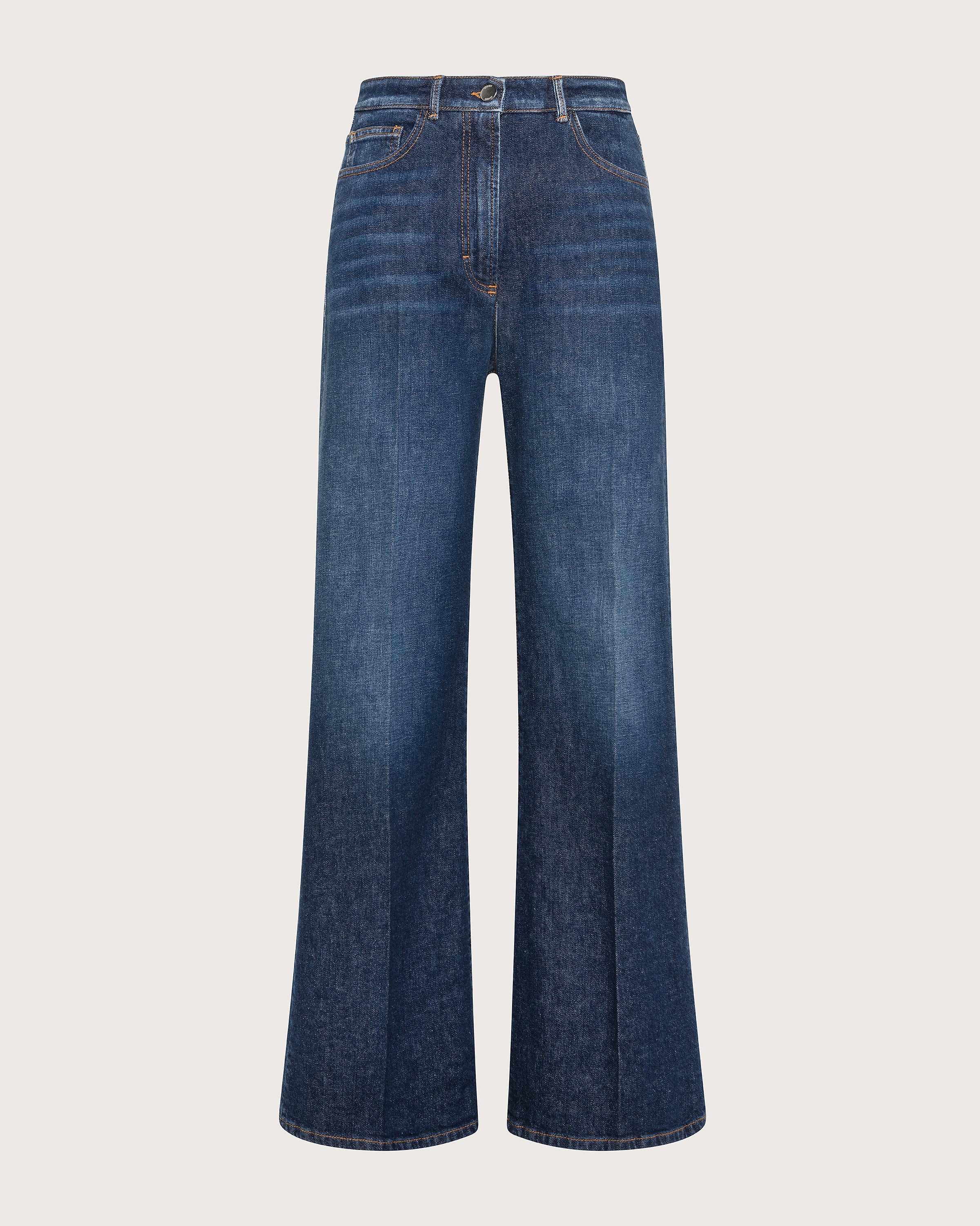 Jeans lunghi a vita alta con cinque tasche in denim washed. Gamba dritta e ampia. Chiusura frontale con cerniera e bottone.