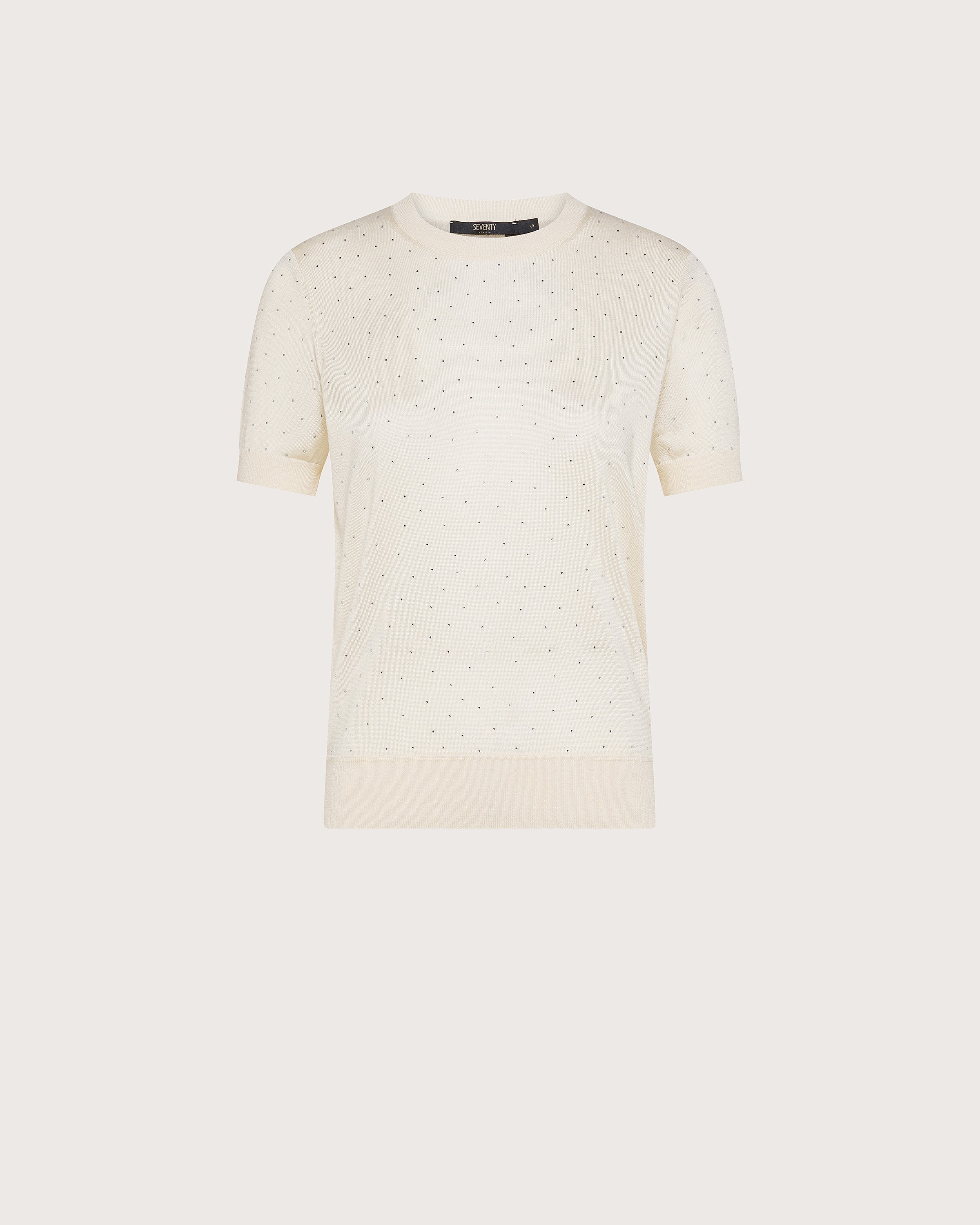 Half-sleeve crewneck sweater in viscose silk with highights.