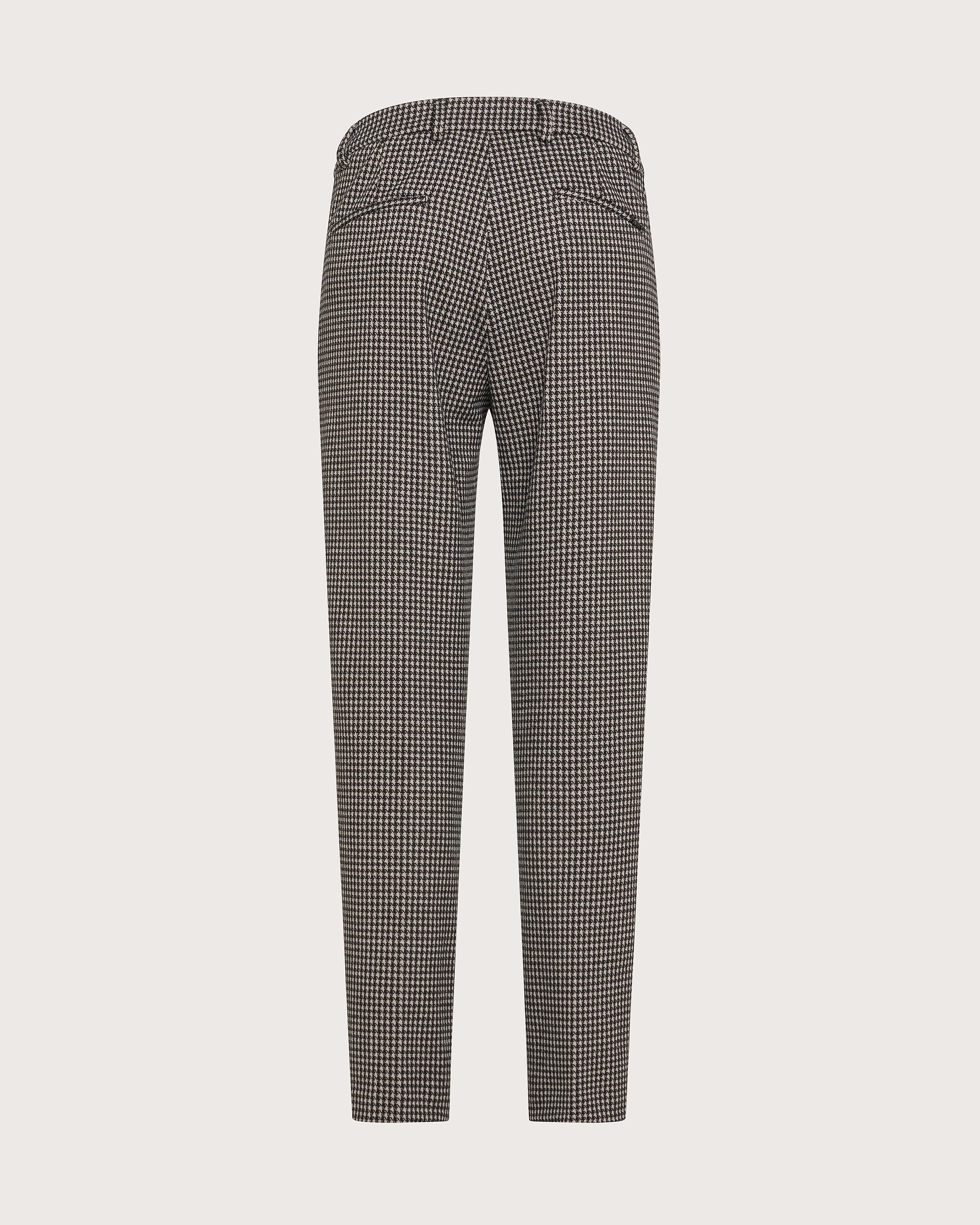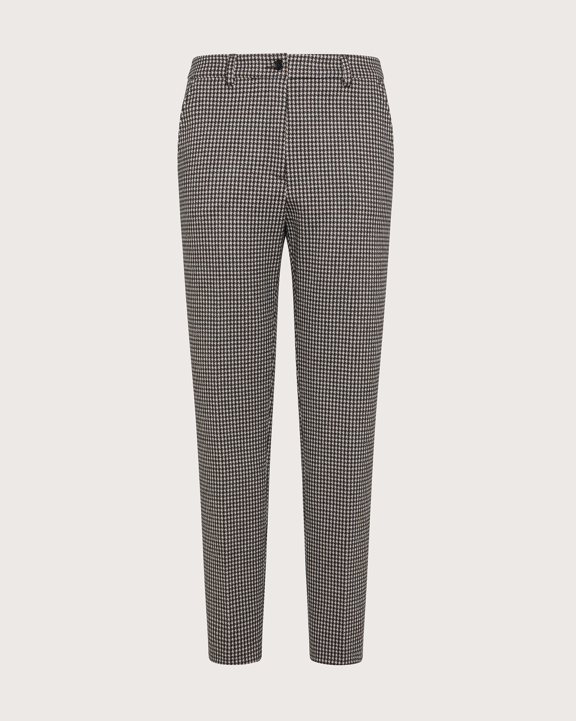 Pantalone mid-rise alla caviglia slim fit realizzato in punto milano jacquard vichy stretch. Tasche laterali davanti e tasche a filetto posteriori. Chiusura frontale con cerniera e bottone in tinta.