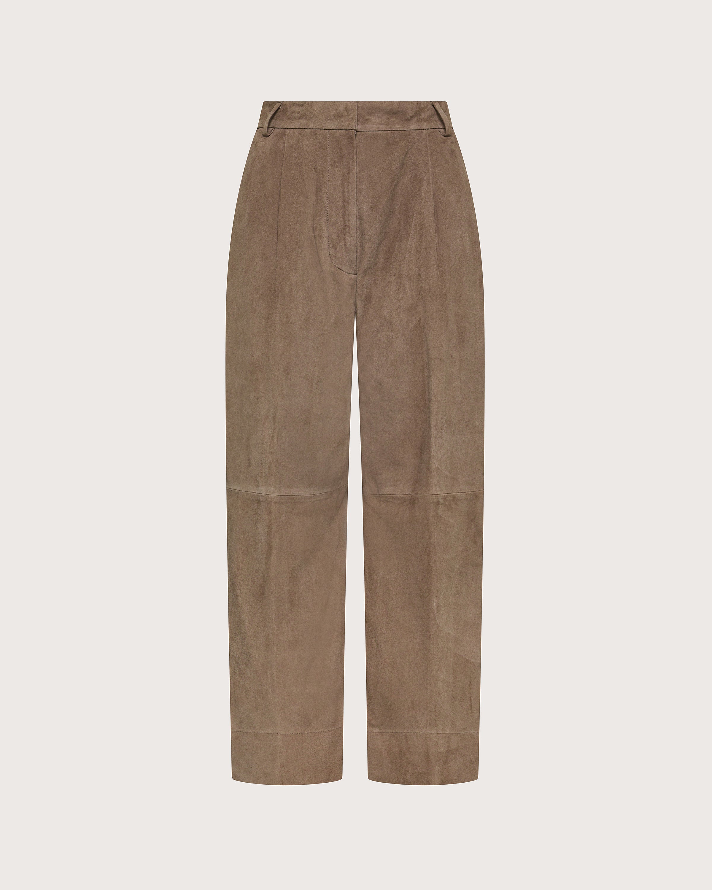 High-waisted suede carrot pants. Fitting carrot and dart.