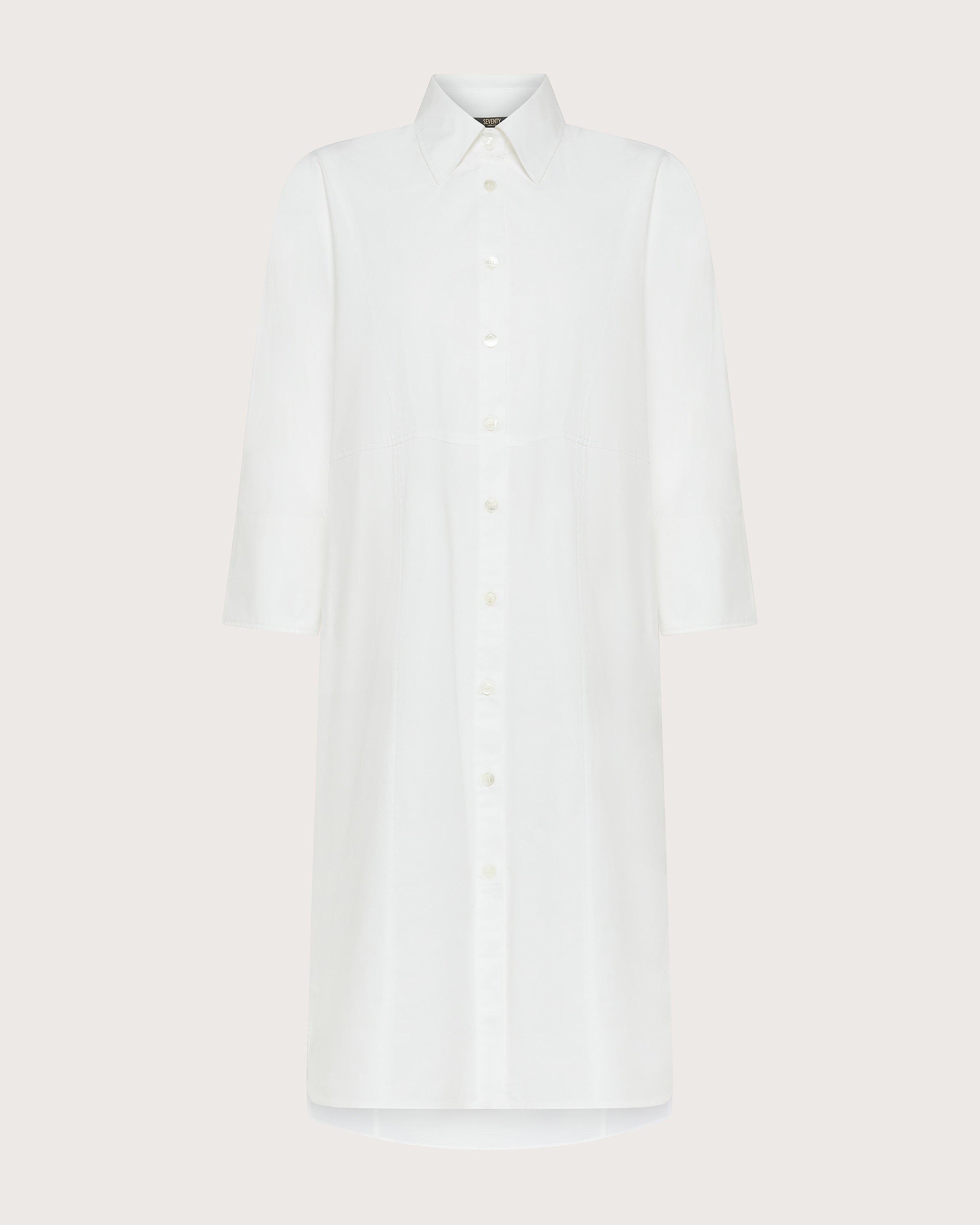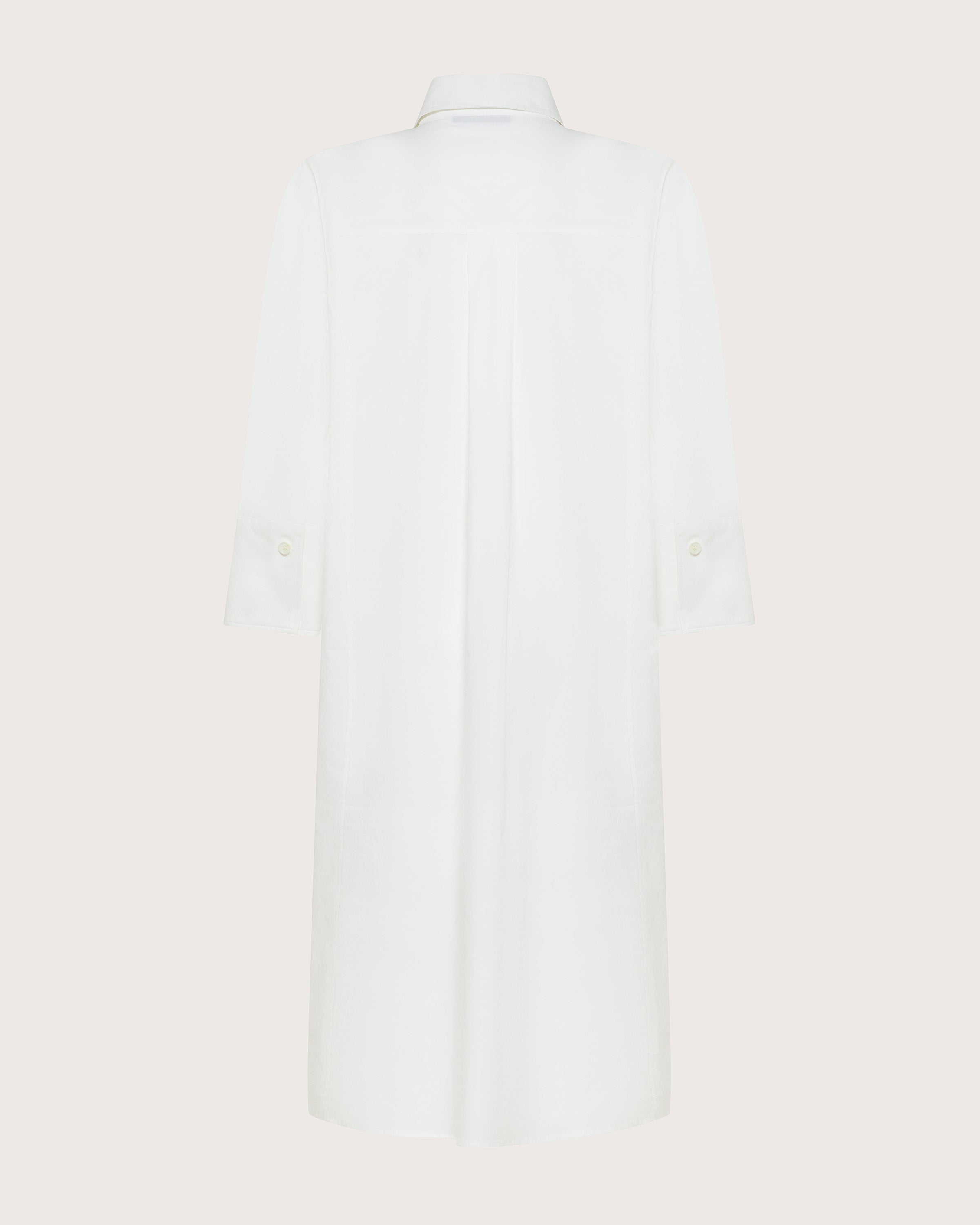 Abito chemisier in popeline stretch unito. Maniche a tre quarti, colletto e polso a camicia.