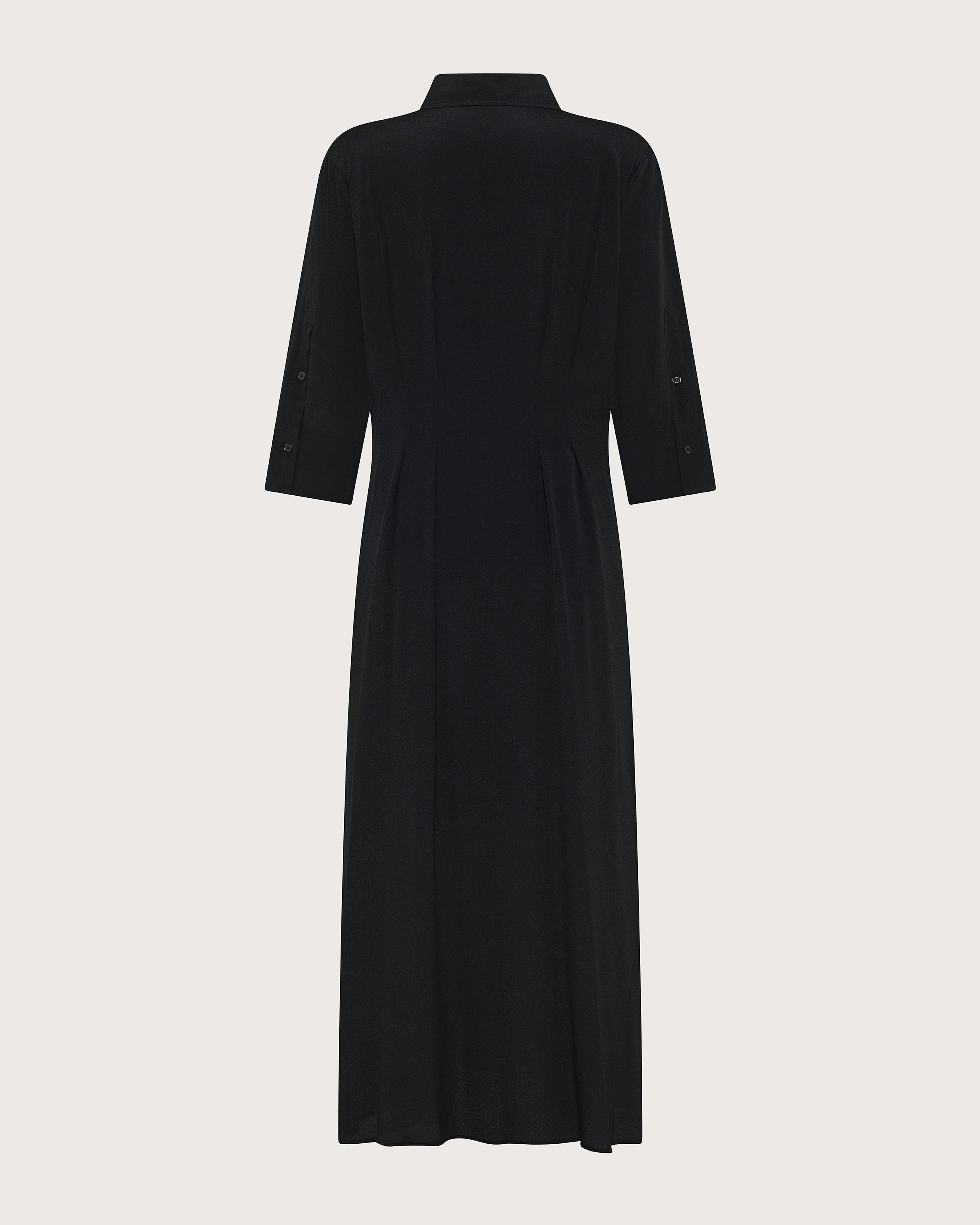 Abito lungo in crêpe misto seta. Maniche a kimono, colletto, scollo profondo e dettagli pinces.