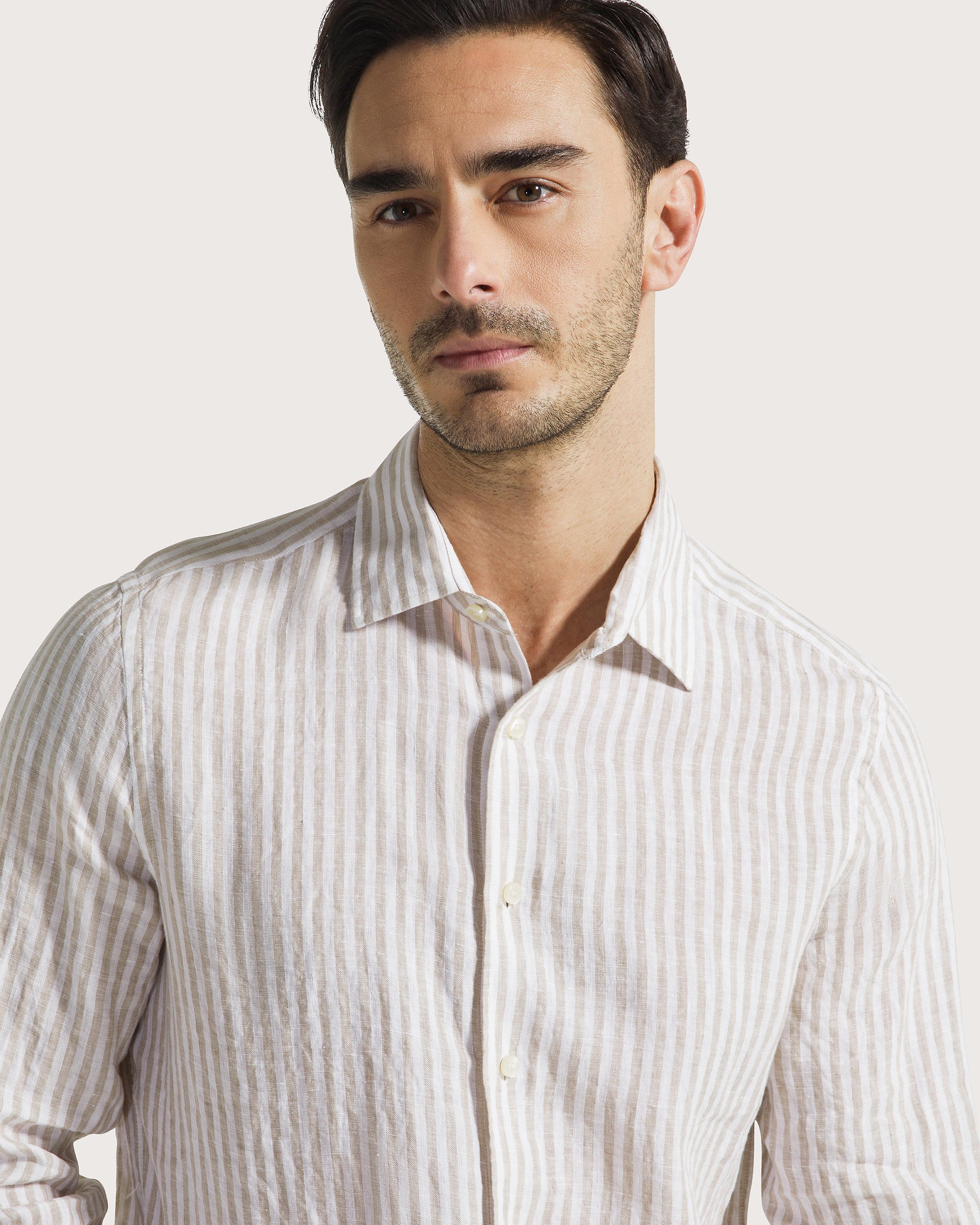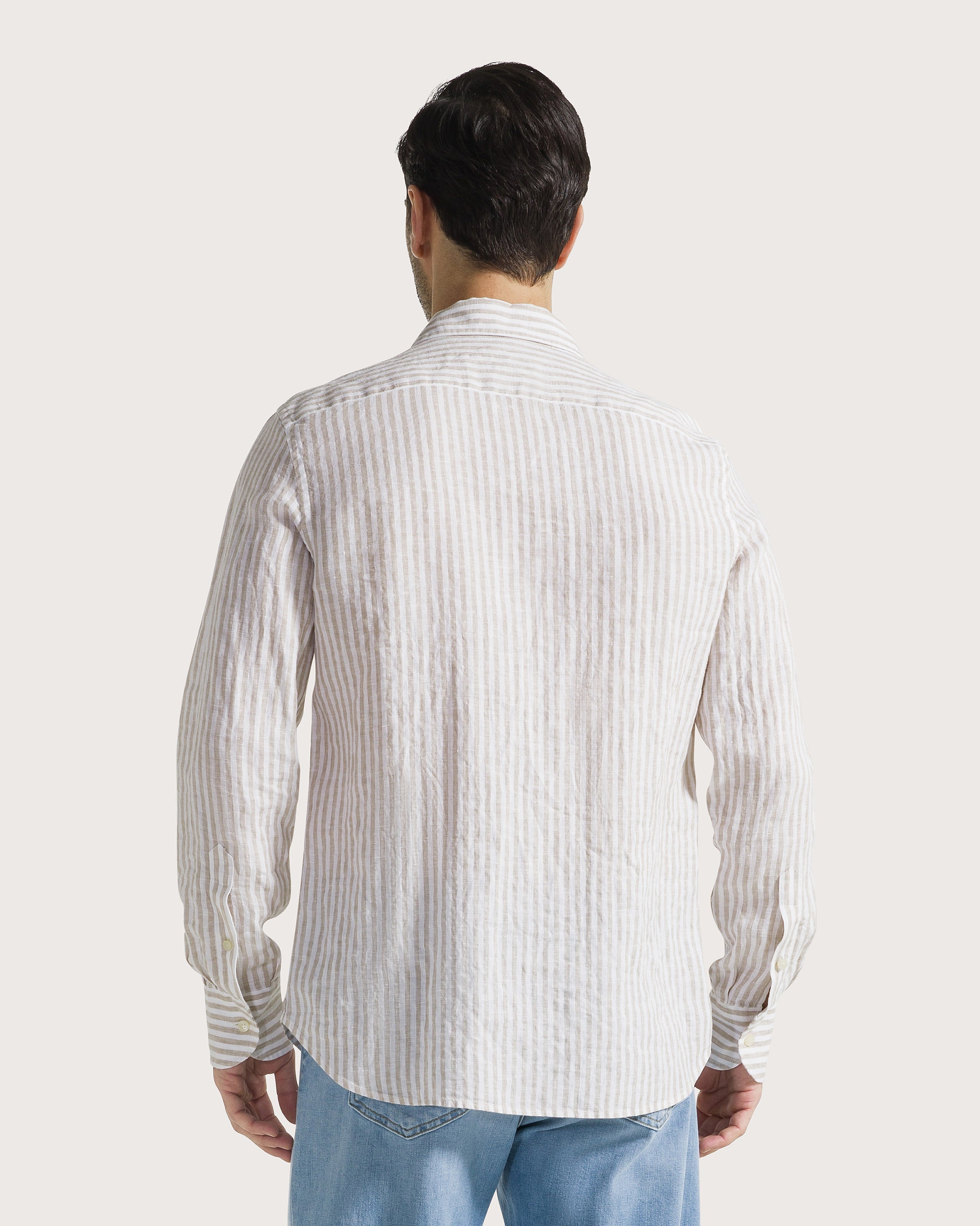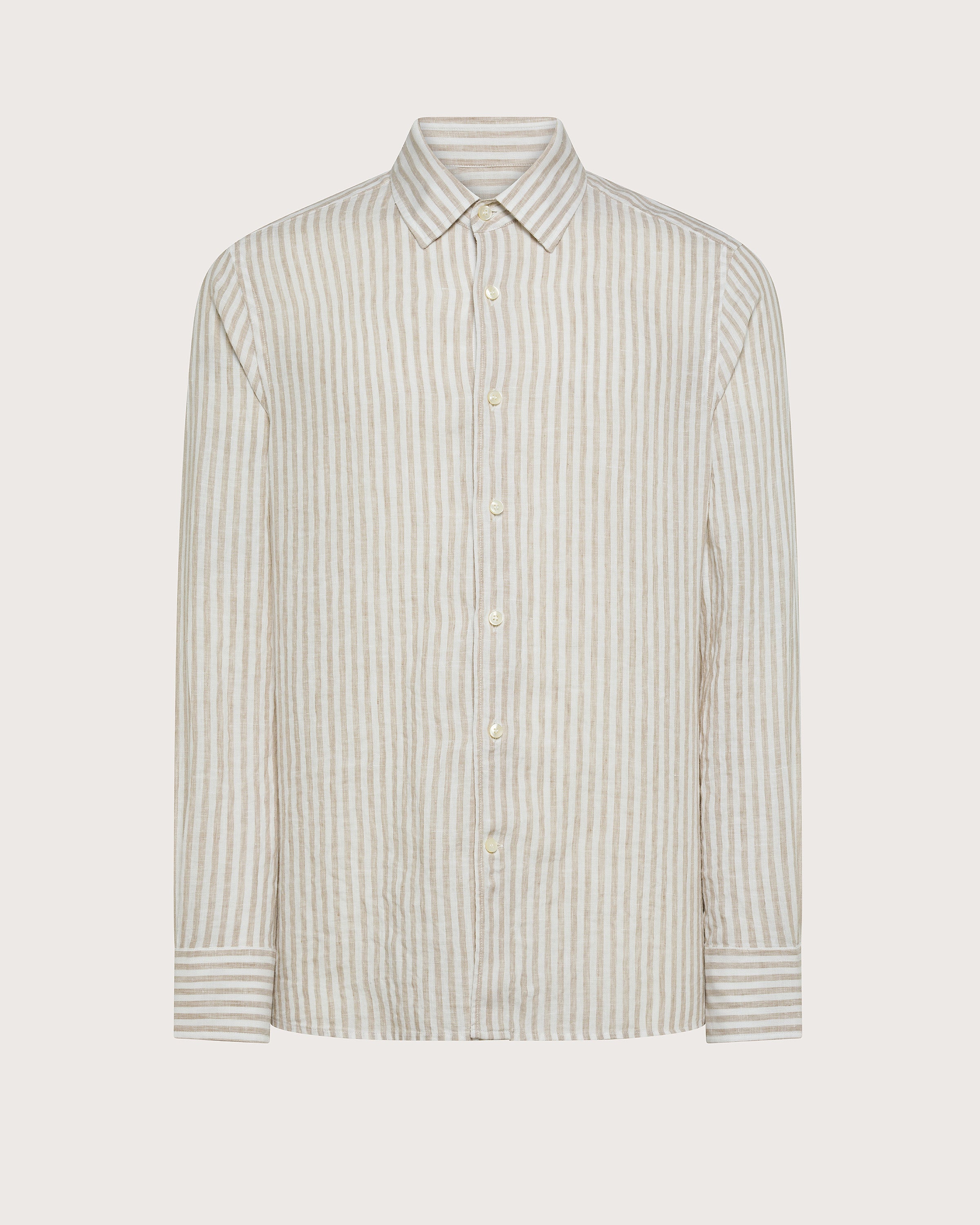 Camicia manica lunga a righe in 100% lino, collo italiano e chiusura centrale con bottoni.