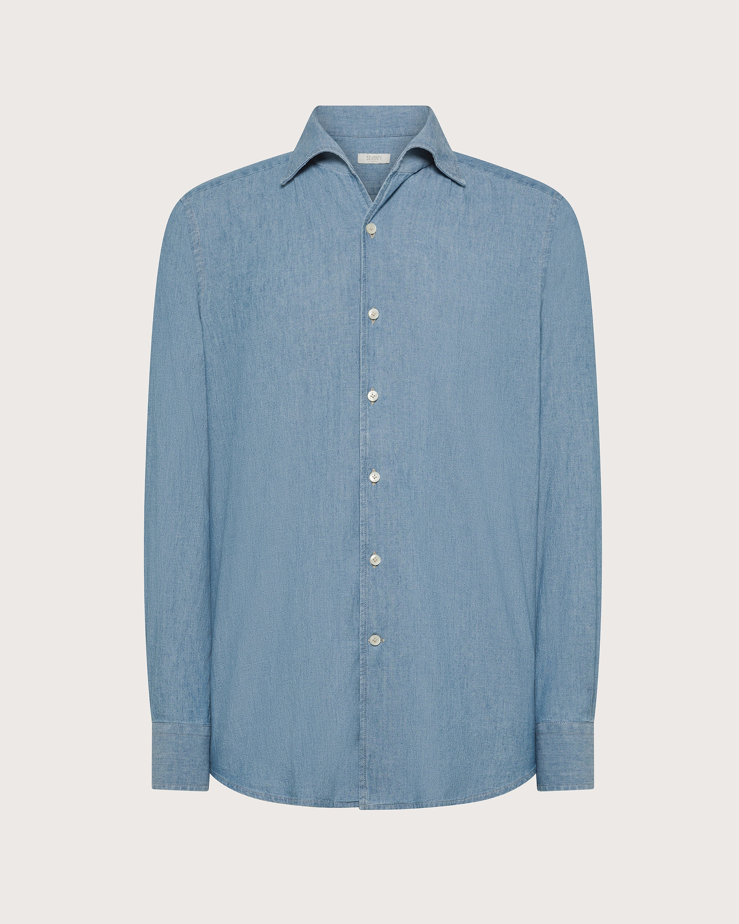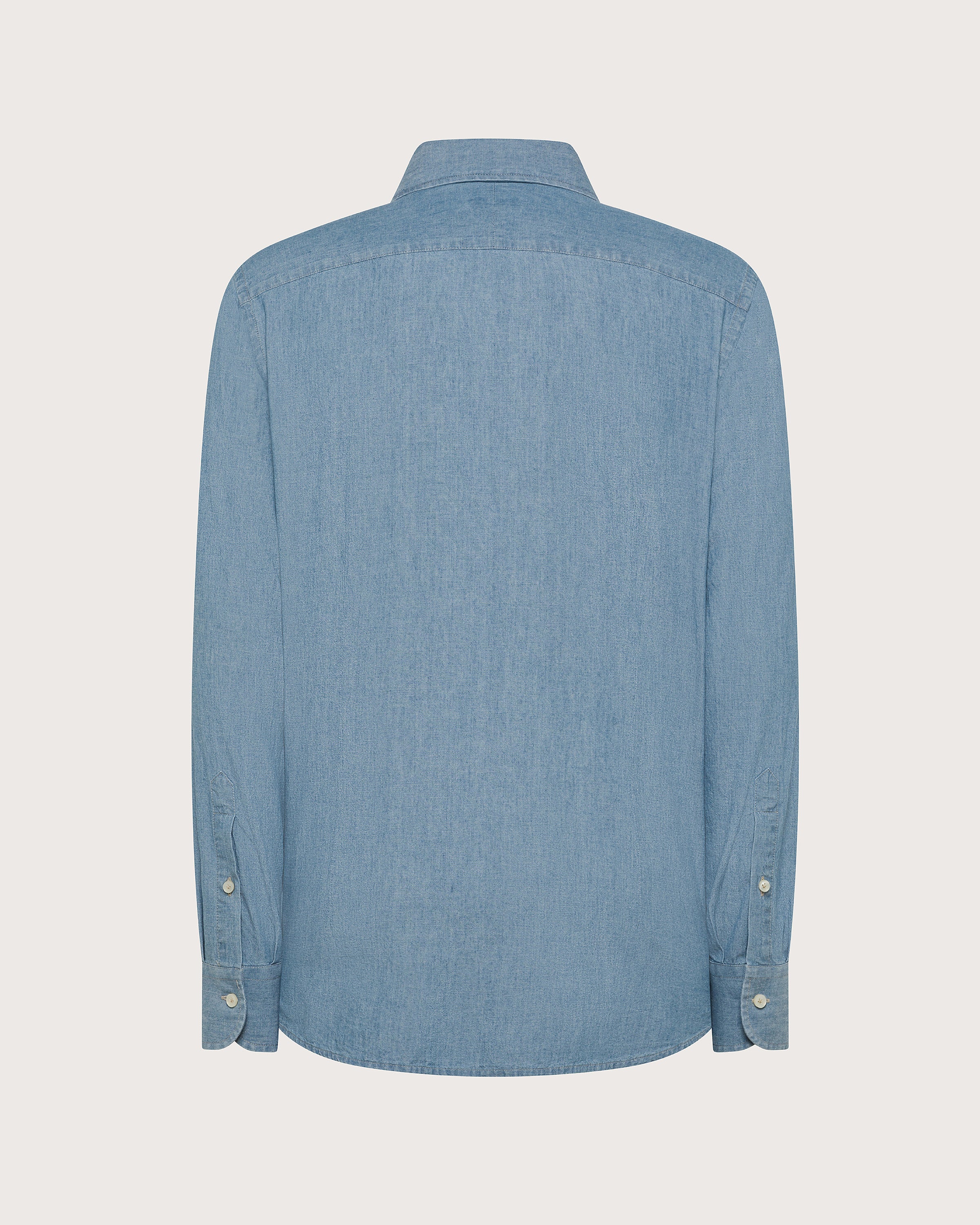 Camicia casual in chambray di cotone. Collo simil button-down con button i nascosti. Maniche lunghe con button e sul polsino.