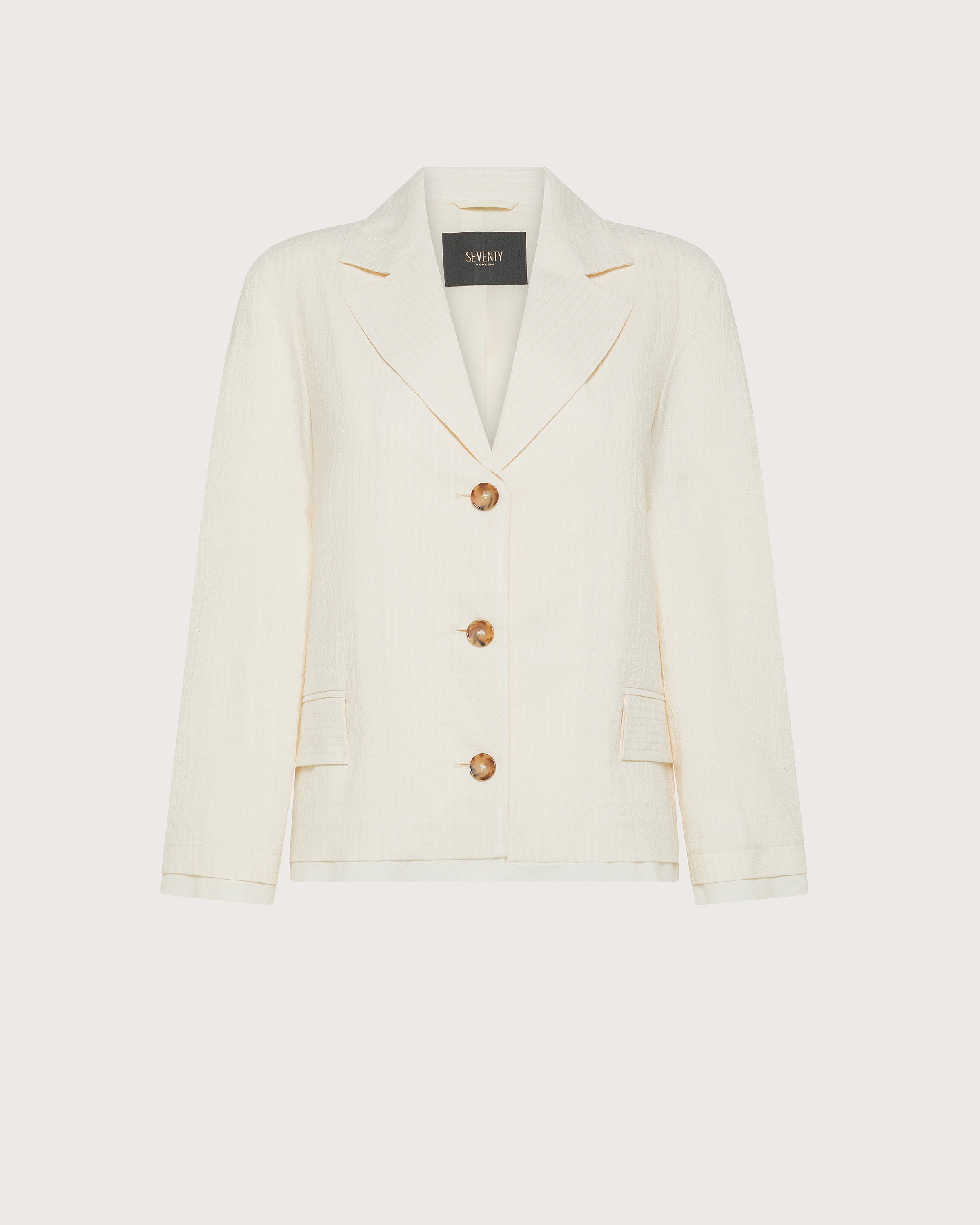 Giacca corta realizzata in cotone grezzo a righe. Revers classico e maniche lunghe. Chiusura con tre bottoni frontali e tasche con patta. Dettaglio bordo in tessuto su polsini e fondo capo.