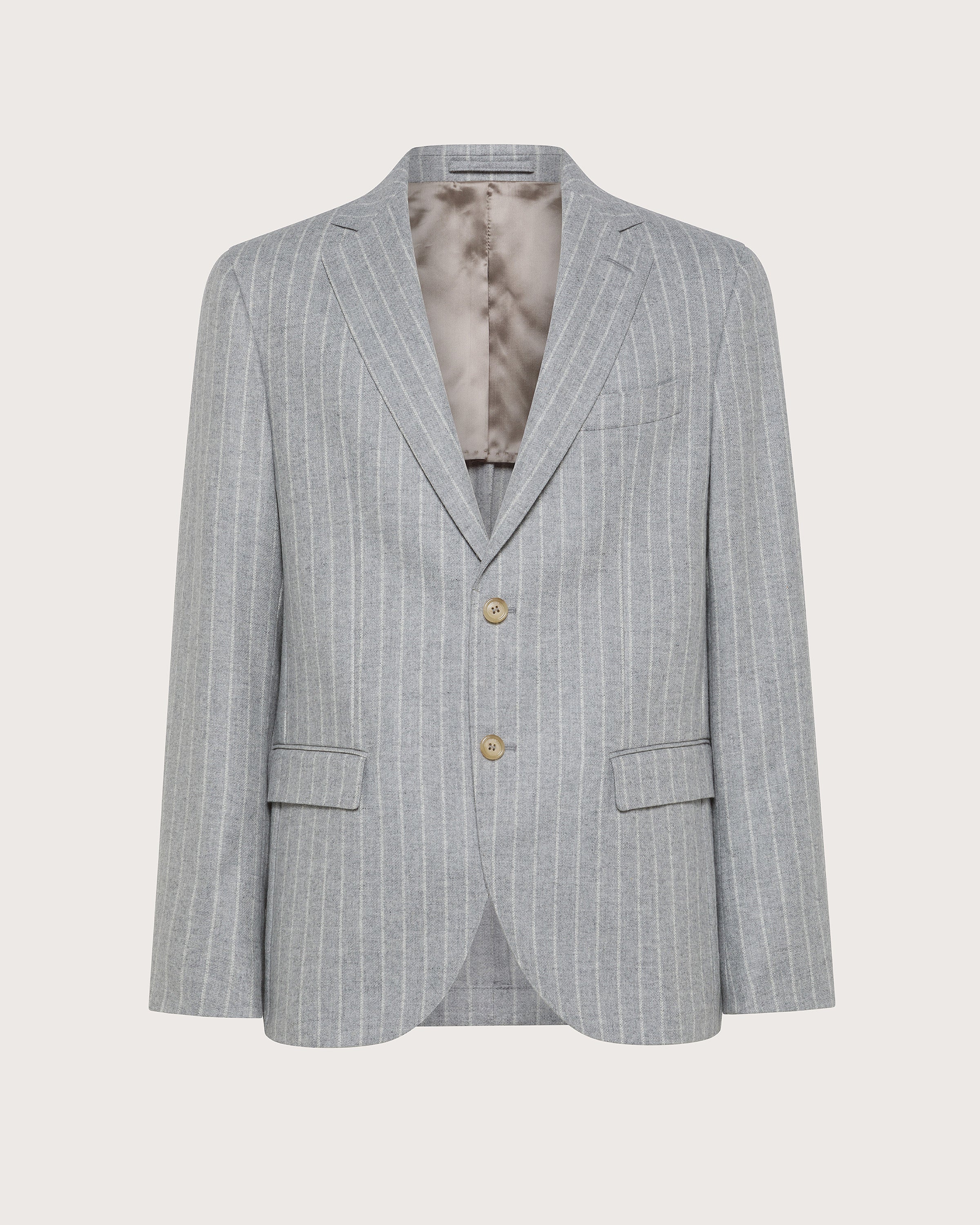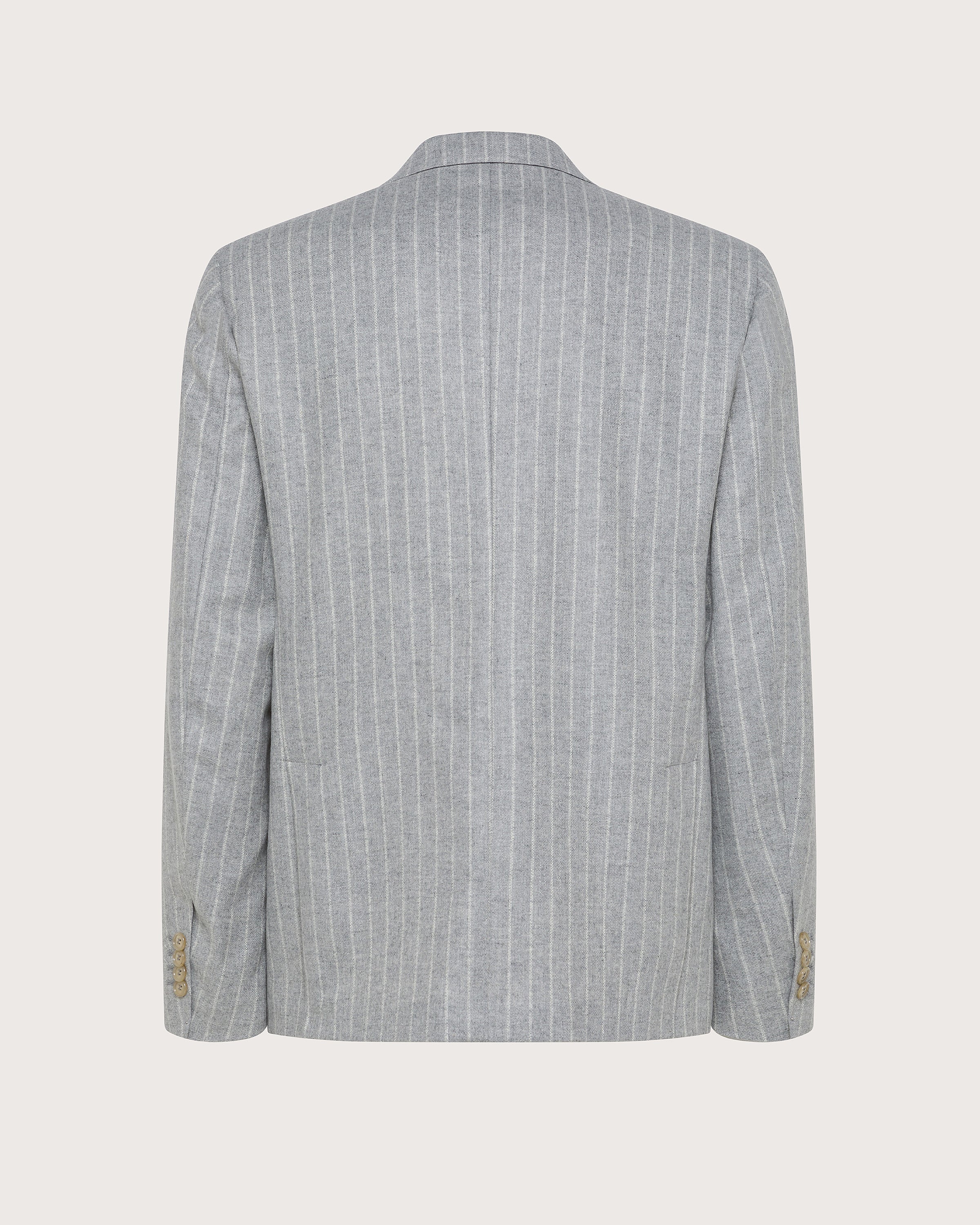 Giacca monopetto realizzata in gessato cardato misto lana. Collo a revers classici. Maniche lunghe con dettaglio di bottoni sul polsino. Tasche a toppa sui fianchi e pistagna sul petto. Spacchetti laterali. Semifoderata con due tasche a filetto interne, una con bottoncino.