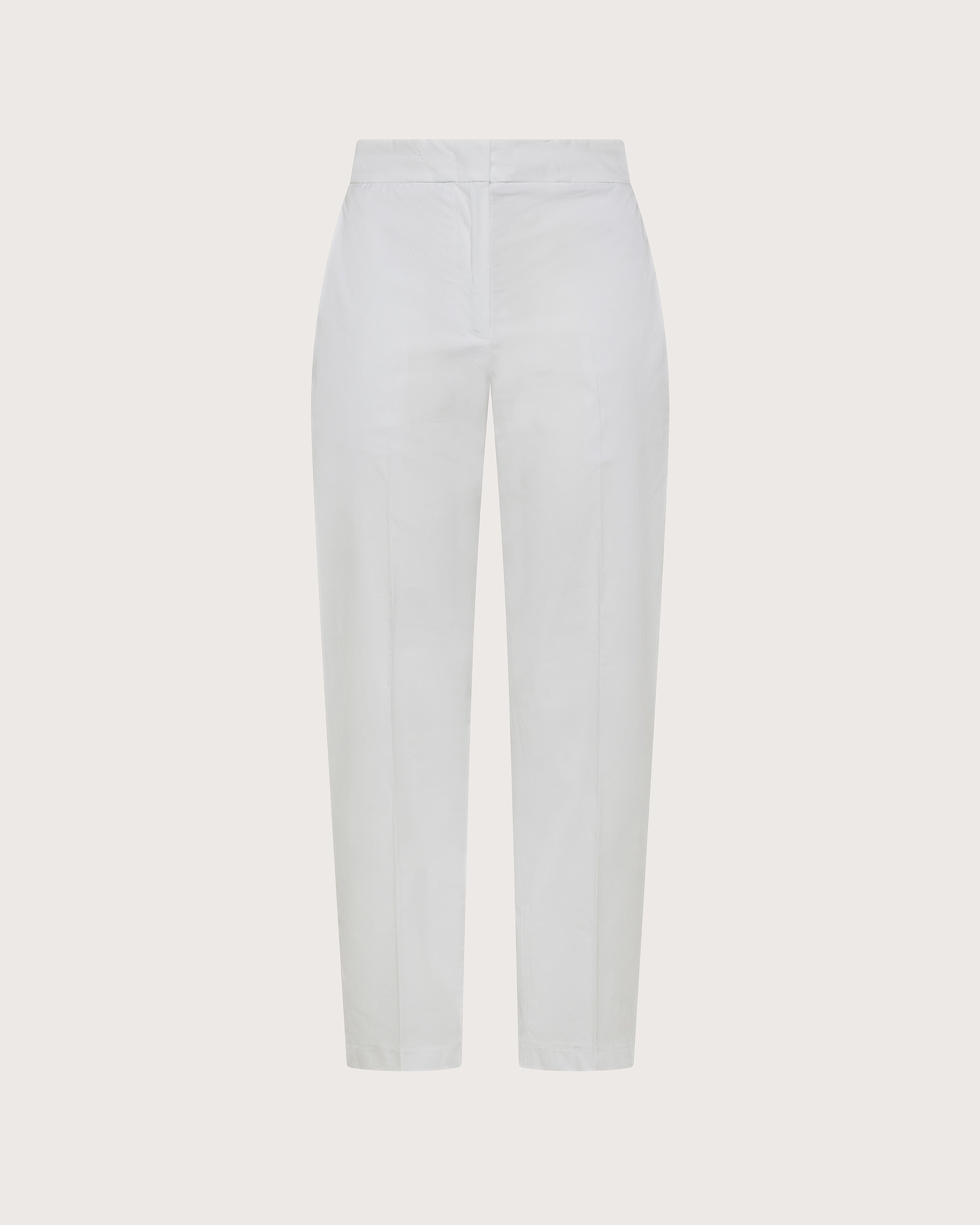 Pantalone alla caviglia in popeline stretch unito. Linea leggermente carrot fit con cinturino piatto davanti ed elasticato dietro. Tasche laterali anteriori e tasche a filetto sul retro. Chiusura frontale con cerniera e gancetto.