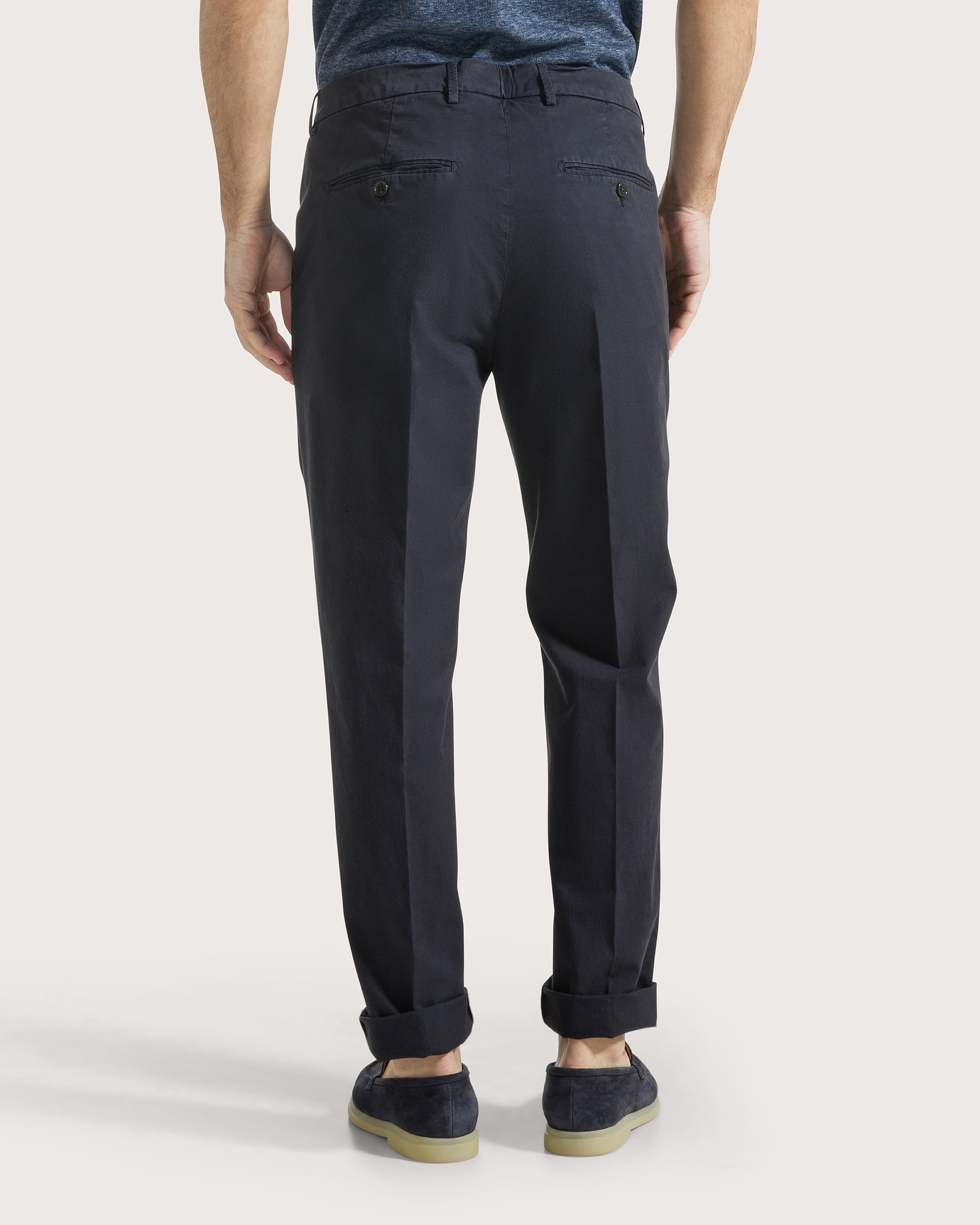 Pantalone chino in gabardine di cotone stretch tinto capo, fit asciutto, chiusura con zip, tasca all 'americana davanti e tasca filetto con bottone sul retro; fondo con balza.