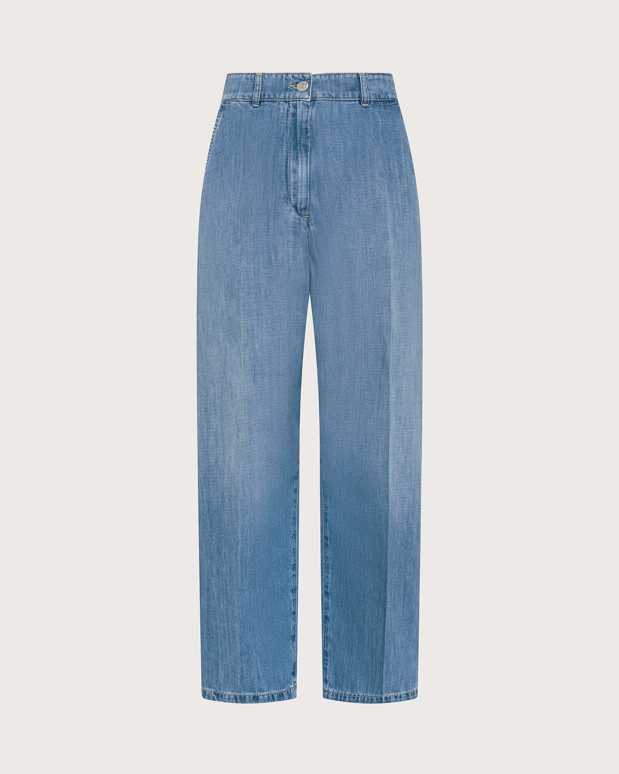 Pantalone dal fit carrot in denim leggero misto lino, passanti in vita e bottone smaltato.