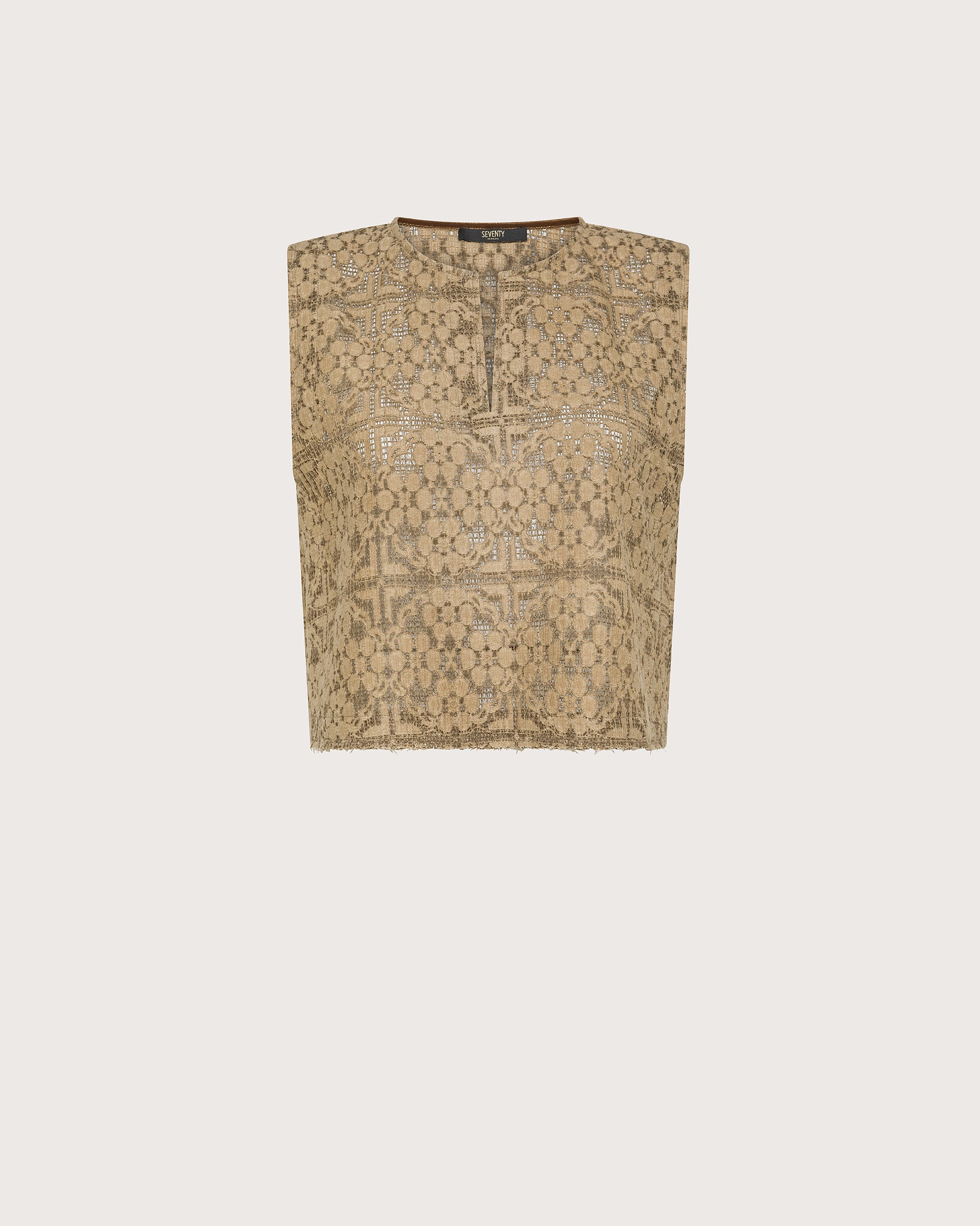 Top corto smanicato in pizzo geometrico tinto effetto vintage. Delicata scollatura sul davanti.