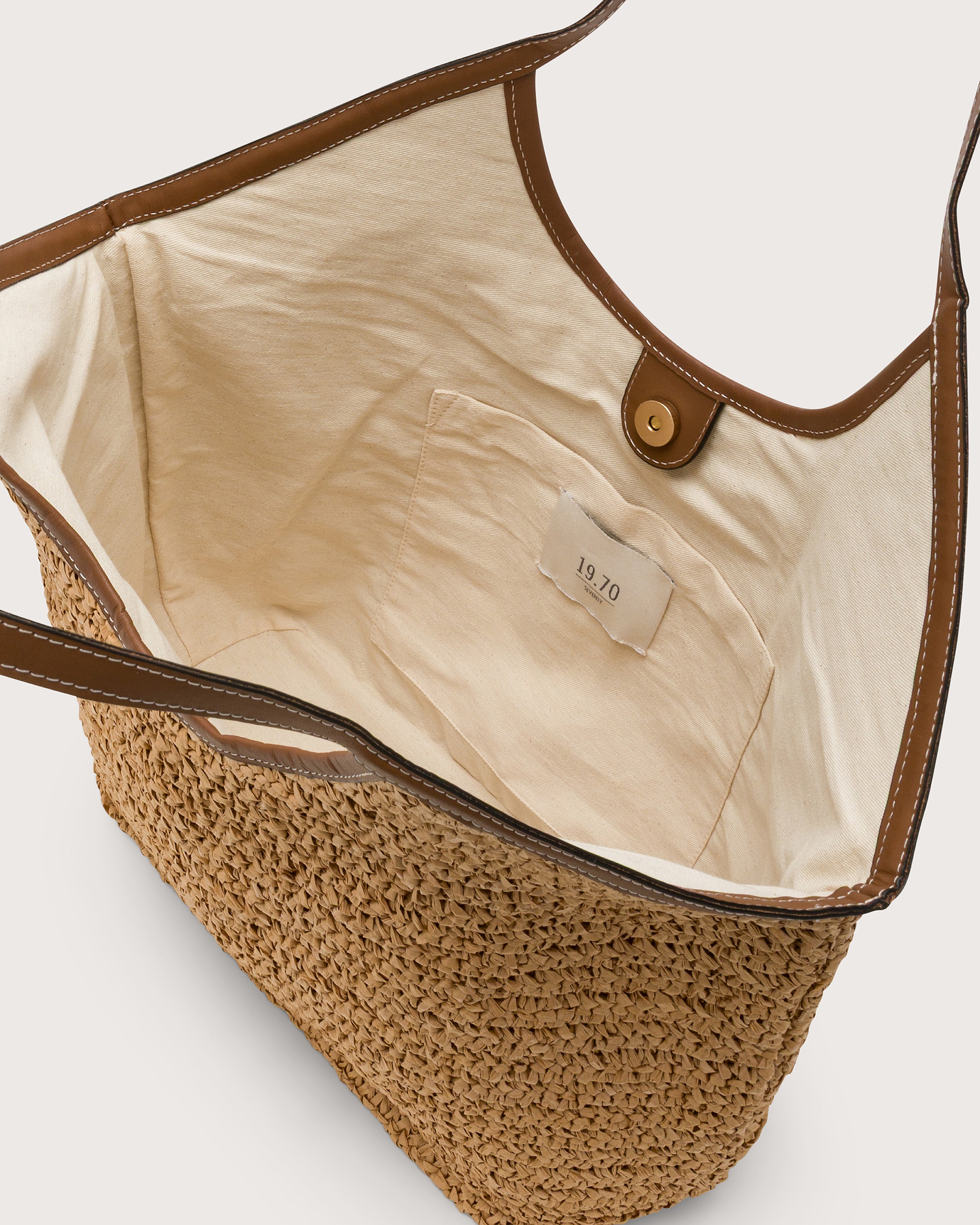 Borsa in rafia con dettagli in pelle nella profilatura.