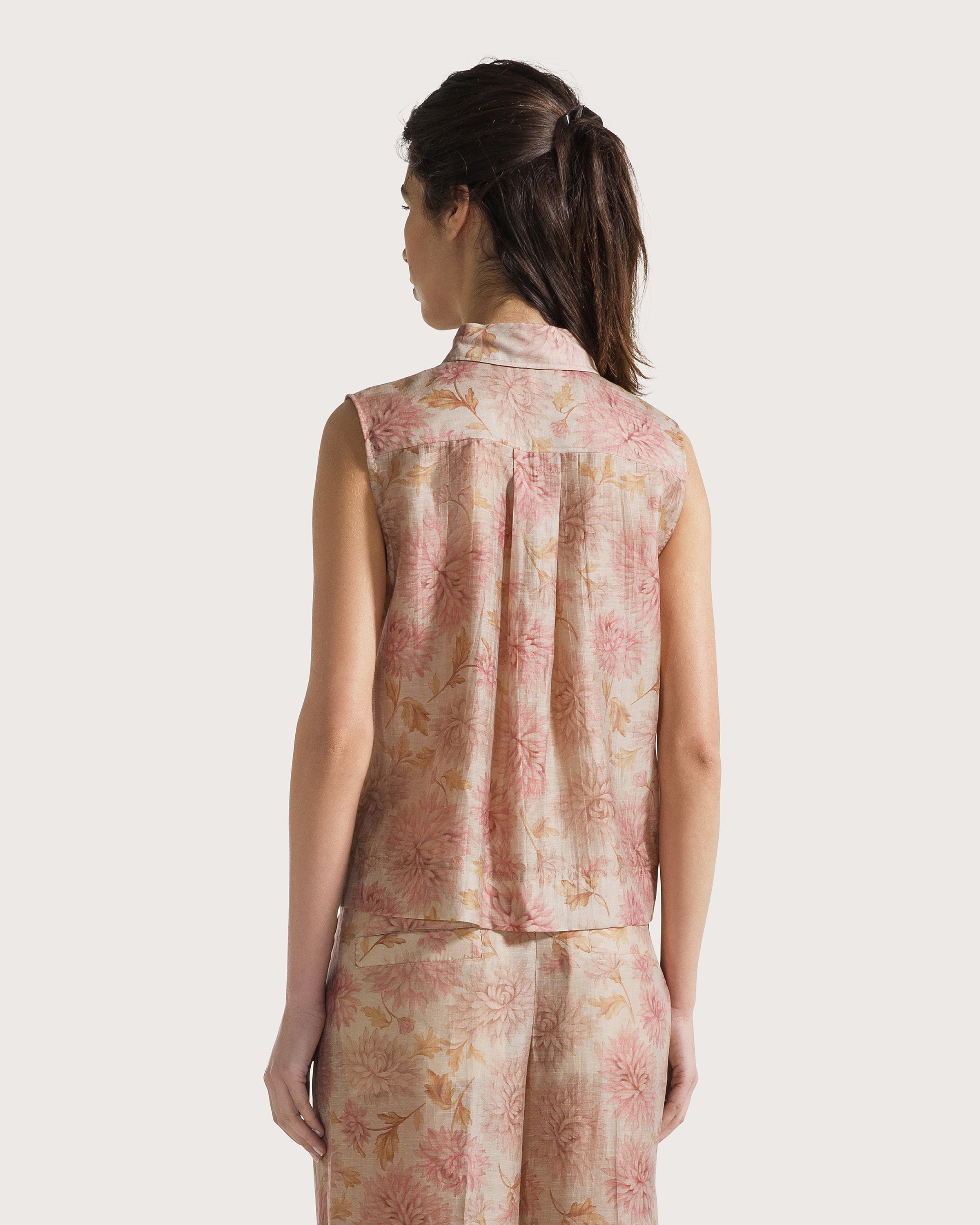 Camicia smanicata in organza di lino crinkle stampa floreale. Collo button down e scollo a polo con bottoni in madreperla.