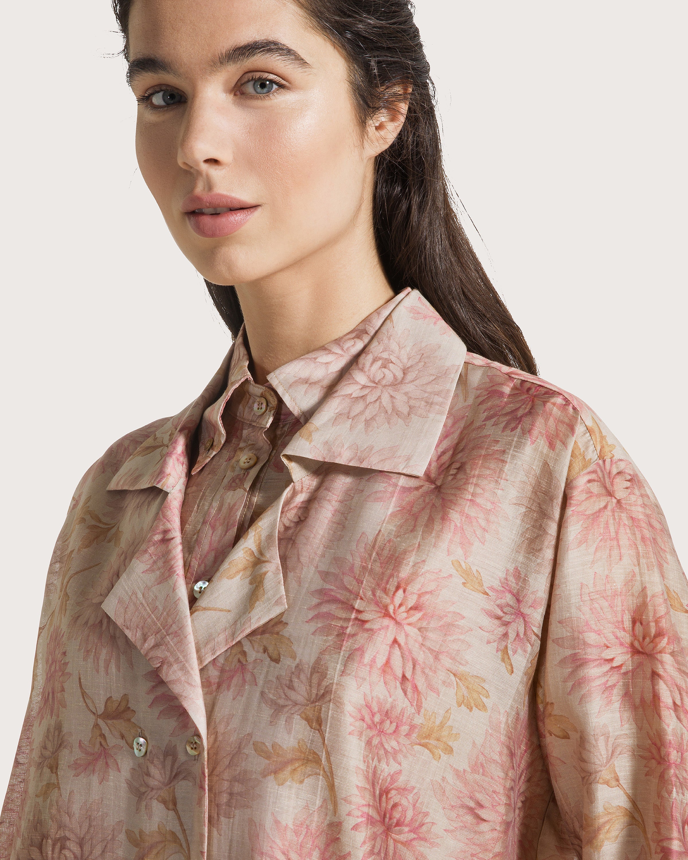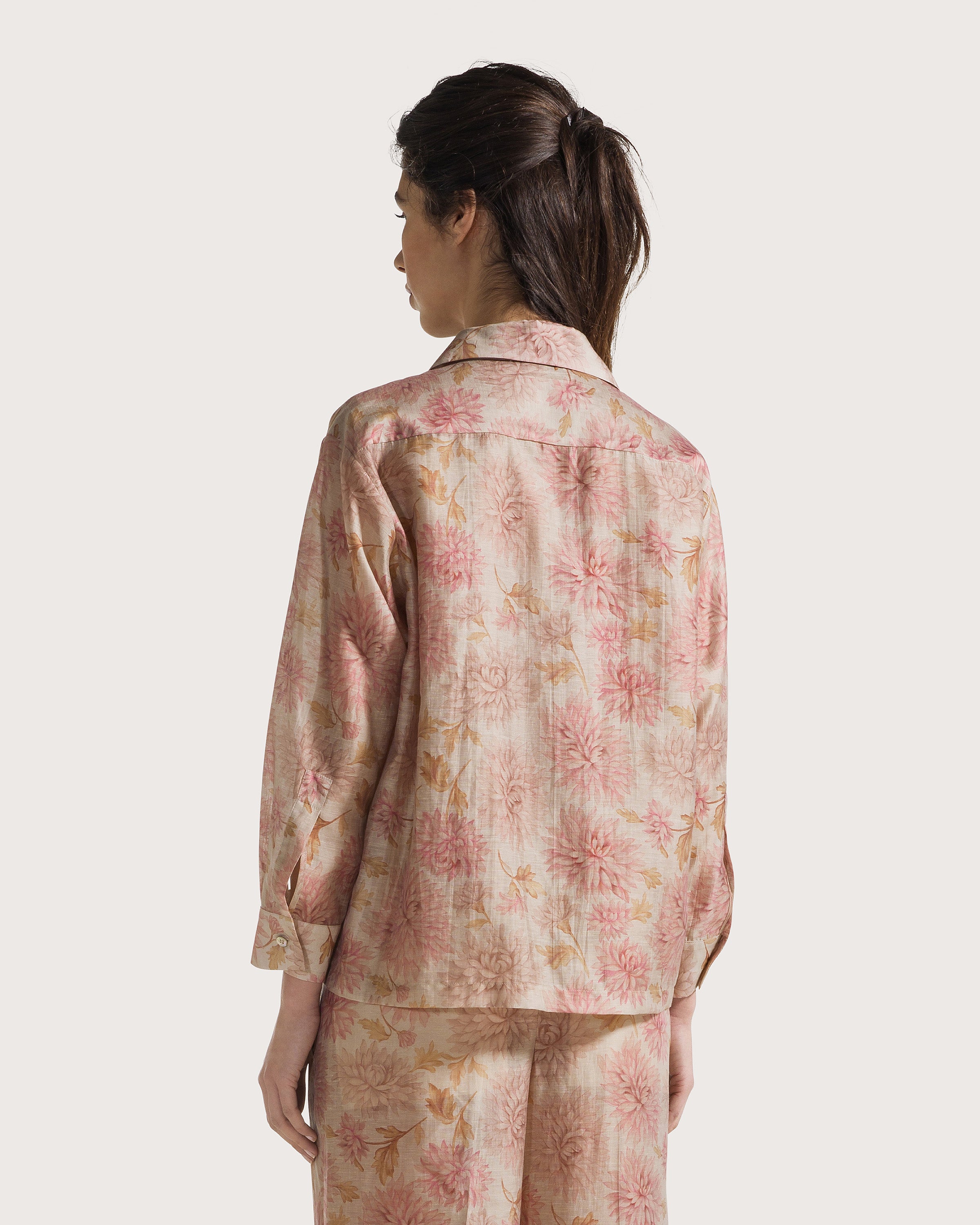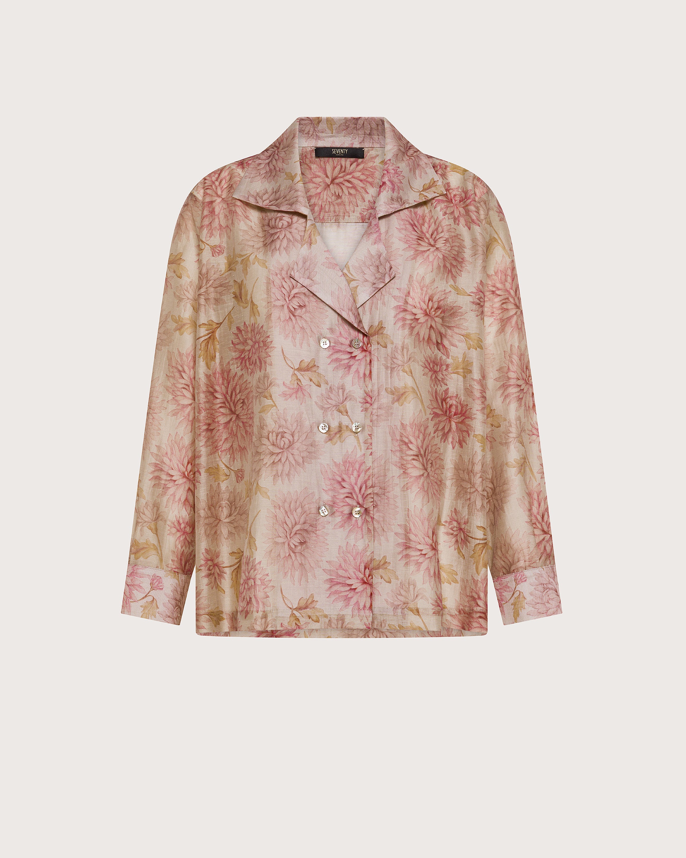 Giacca camicia in organza fiammata con stampa floreale sfumata.