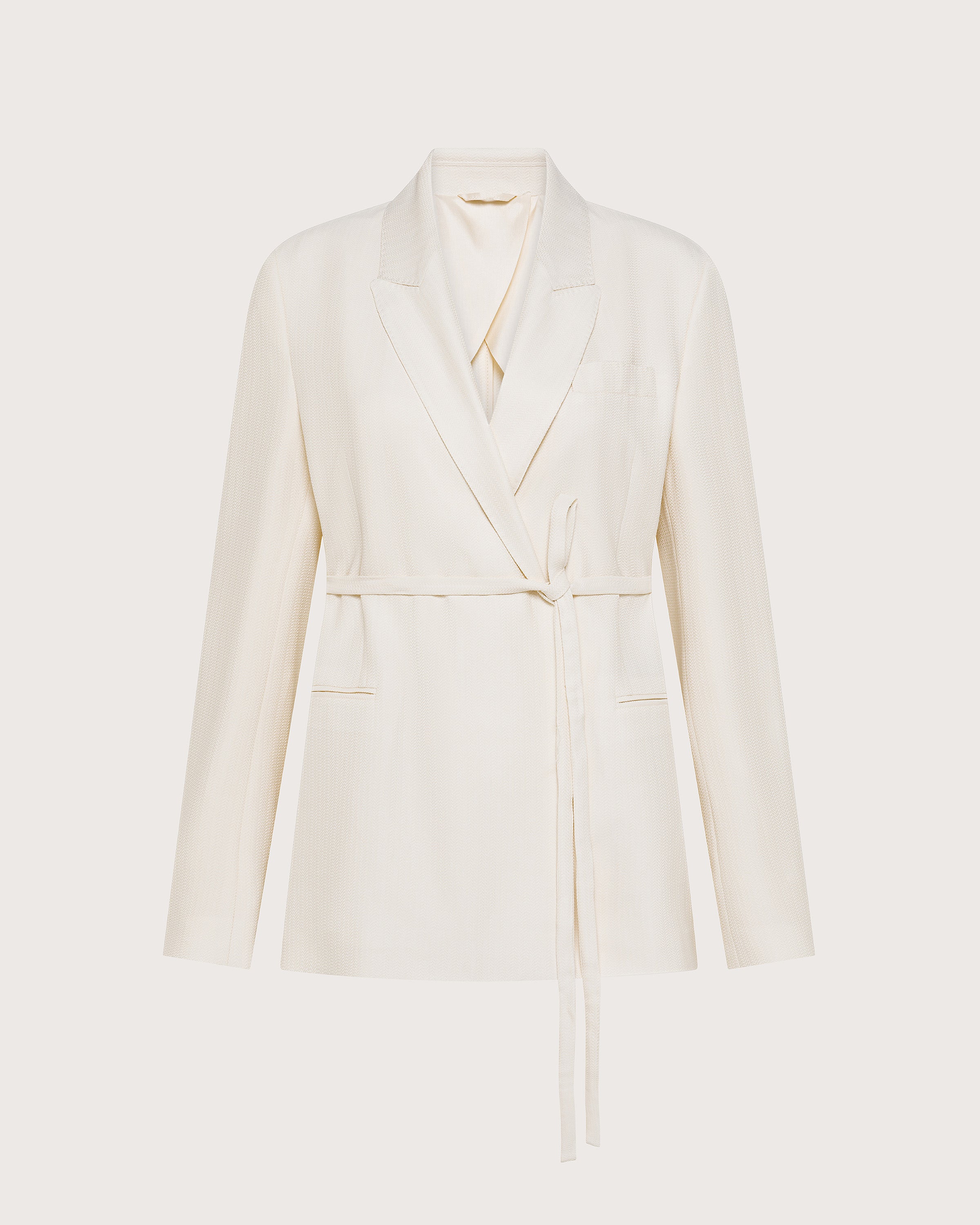 Giacca monopetto con rever a lancia e cinturino in vita in viscosa crepe con disegno microresca.