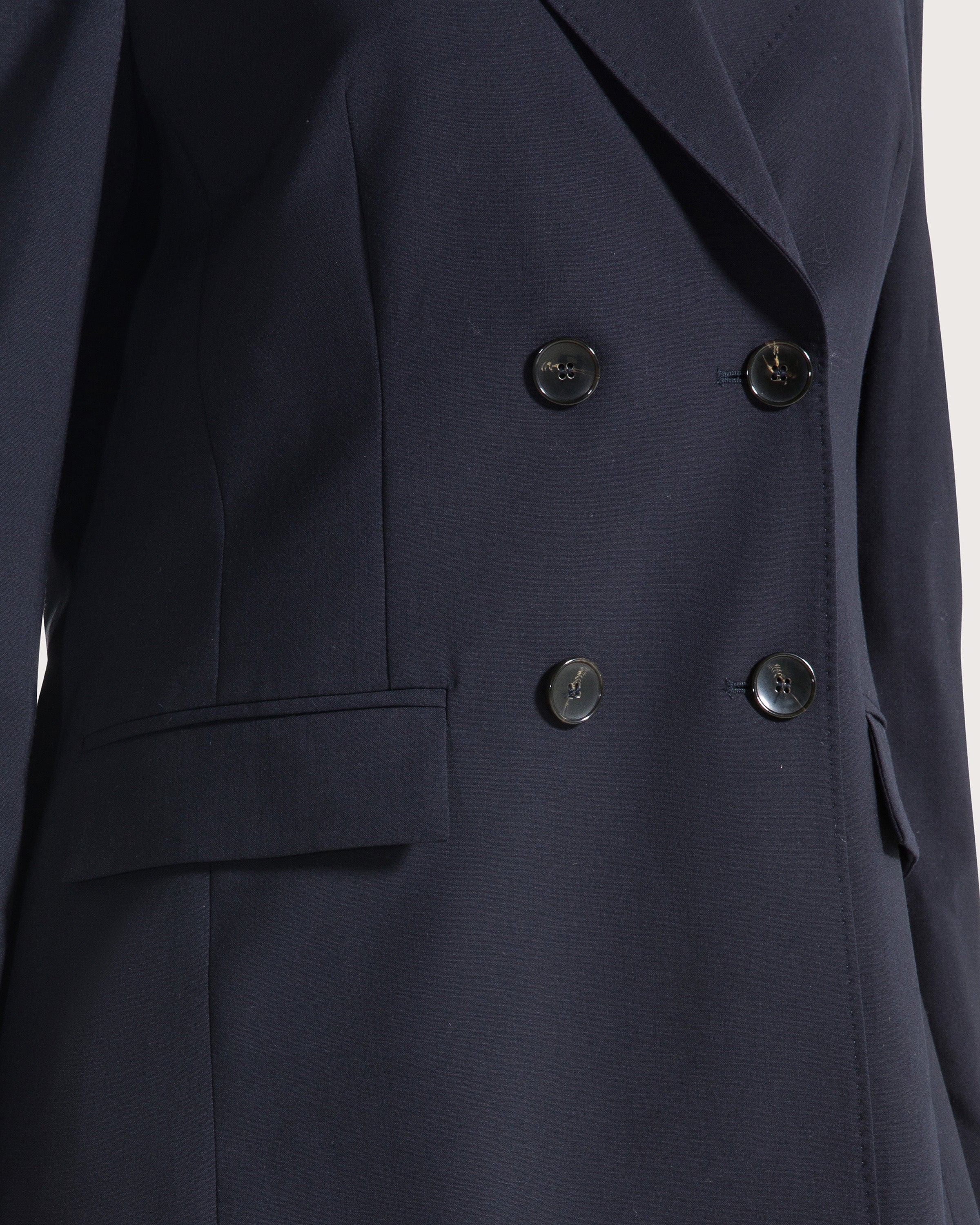 Giacca regular fit doppiopetto realizzata in leggerissimo fresco di lana bistretch. Chiusura doppiopetto con bottoni in tinta. Collo a lancia, tasche con patta e filetto sul petto. Maniche lunghe con spalline.