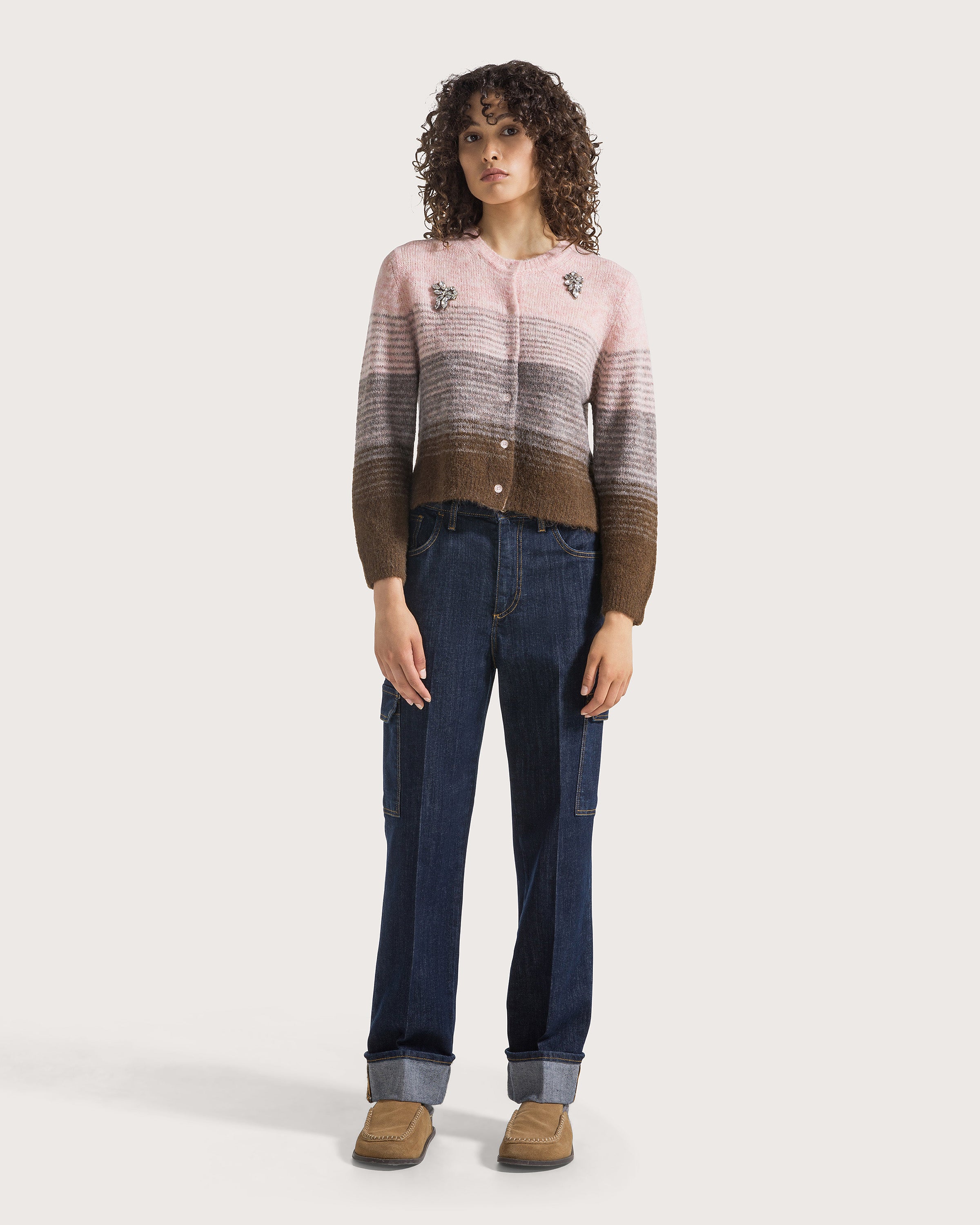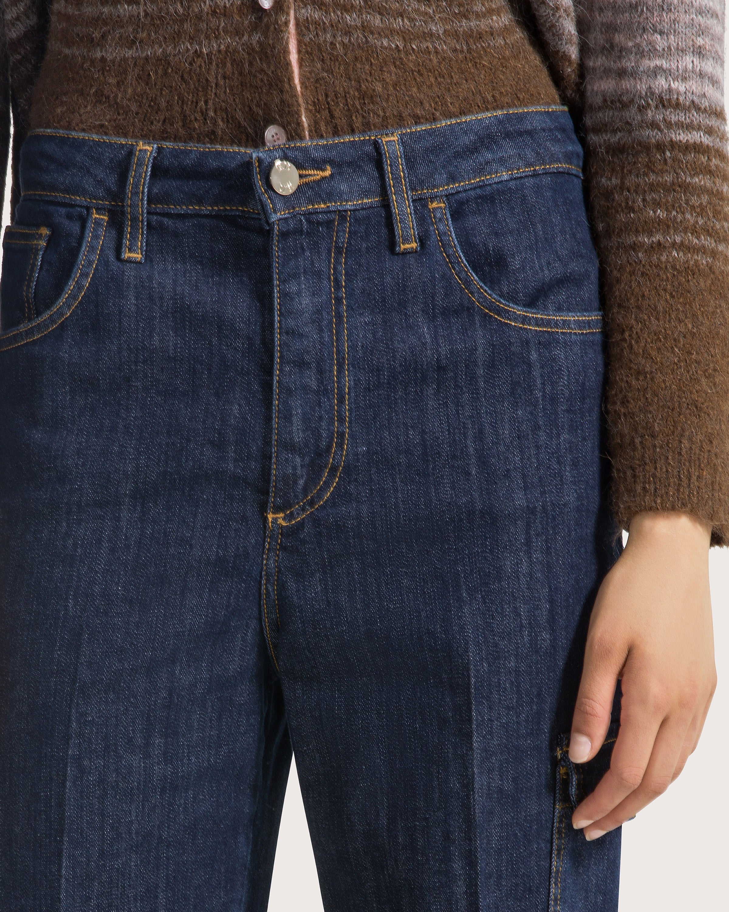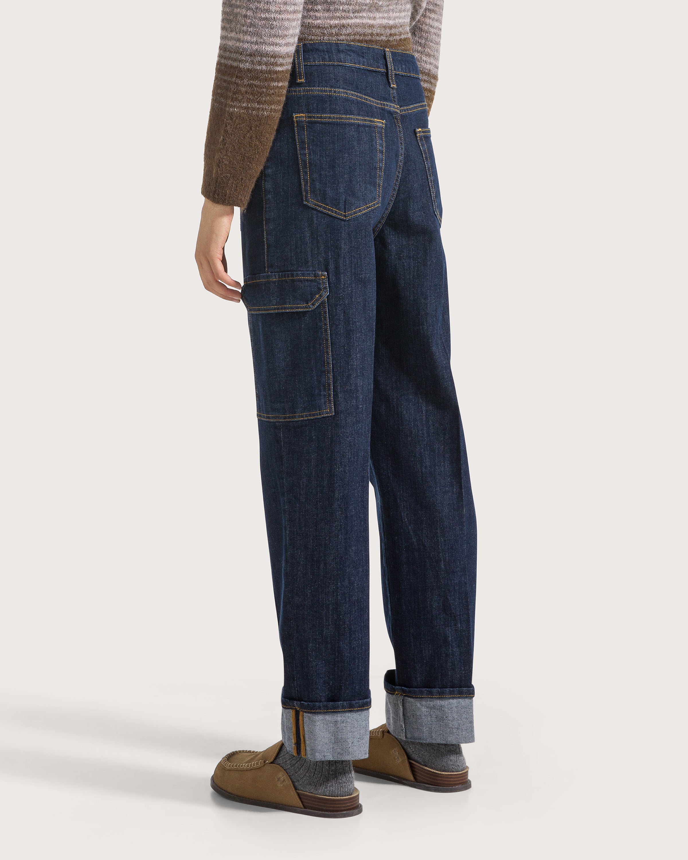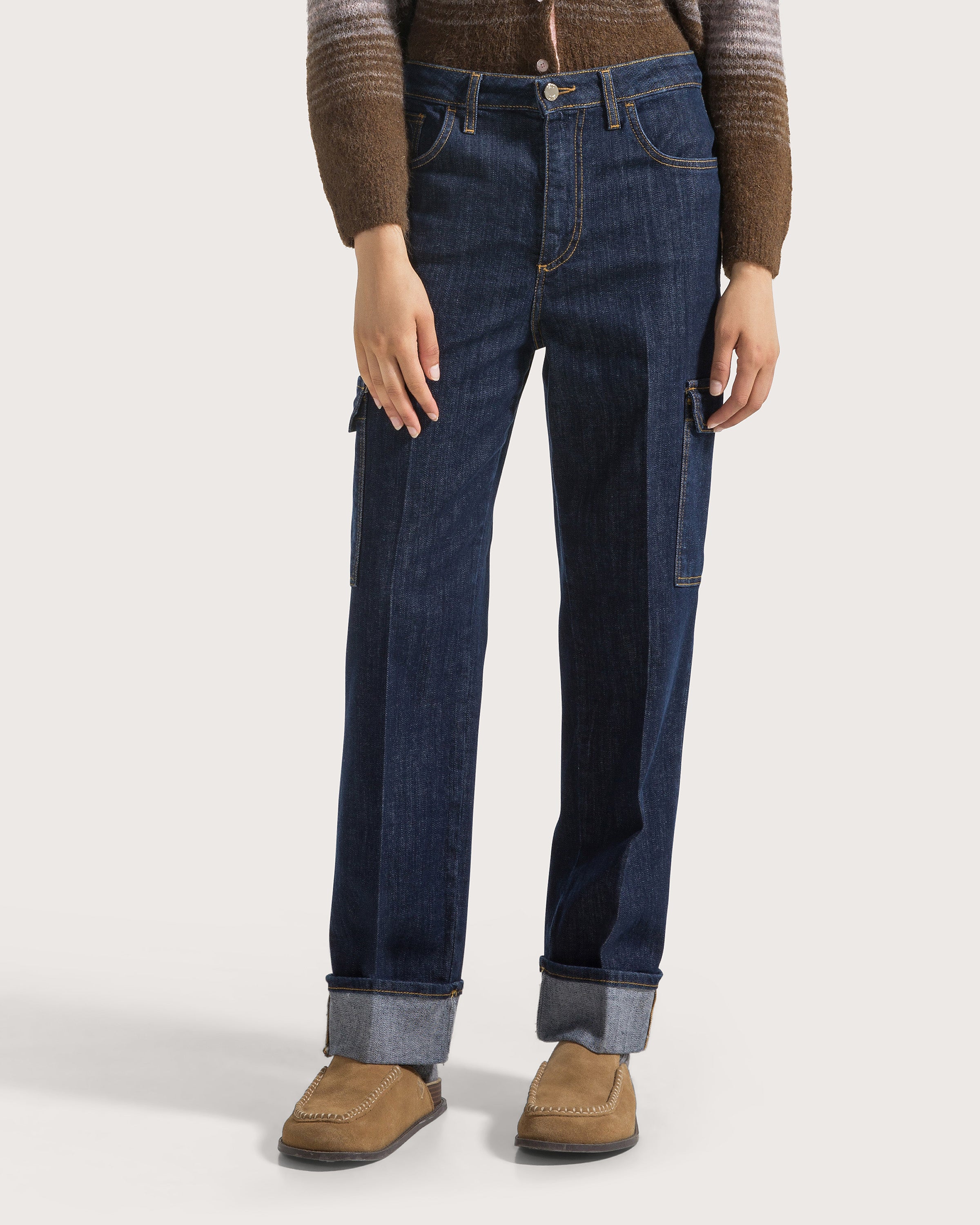 Denim cargo cinque tasche con dettaglio tasca su gamba e risvolto su fondo gamba cucito.