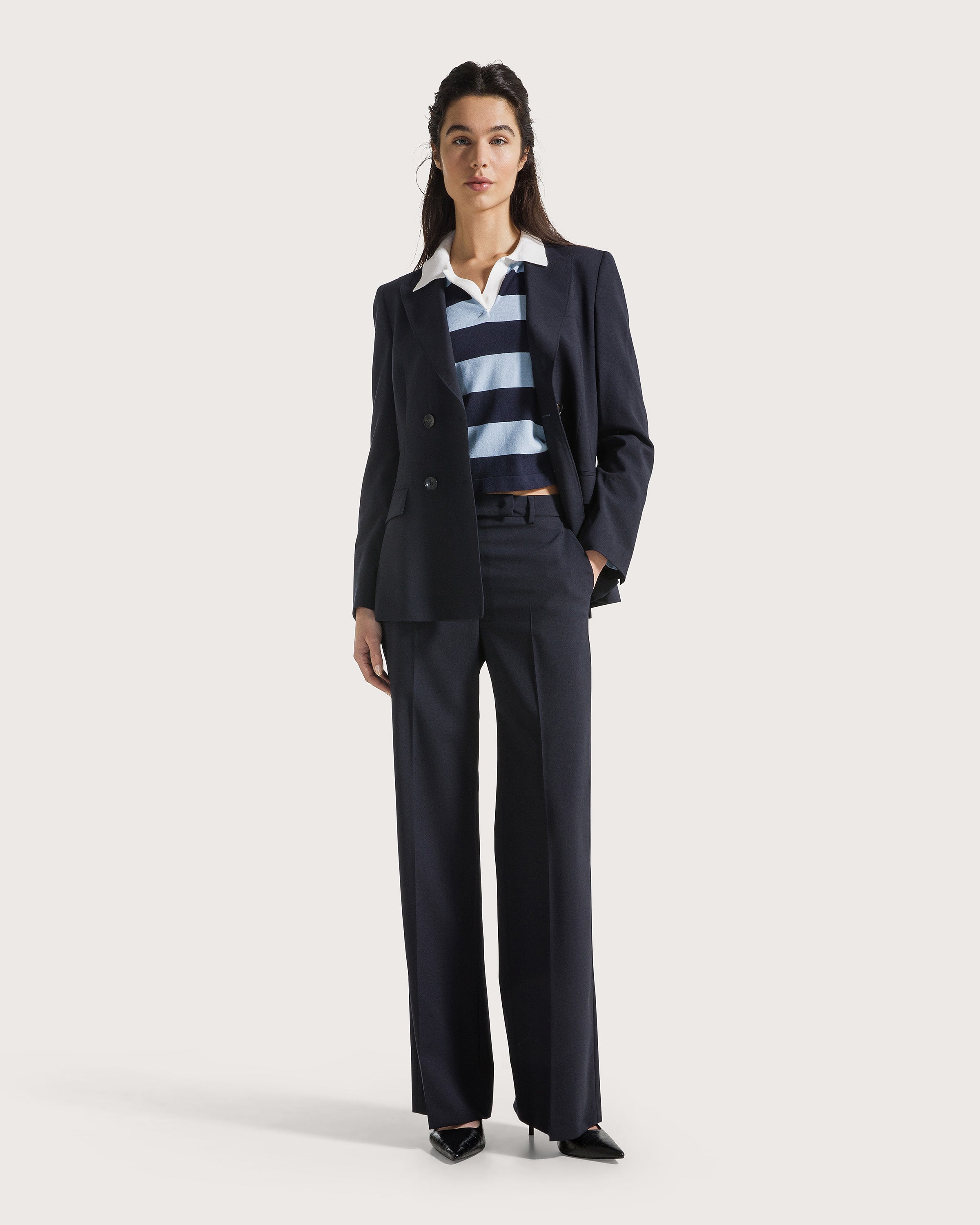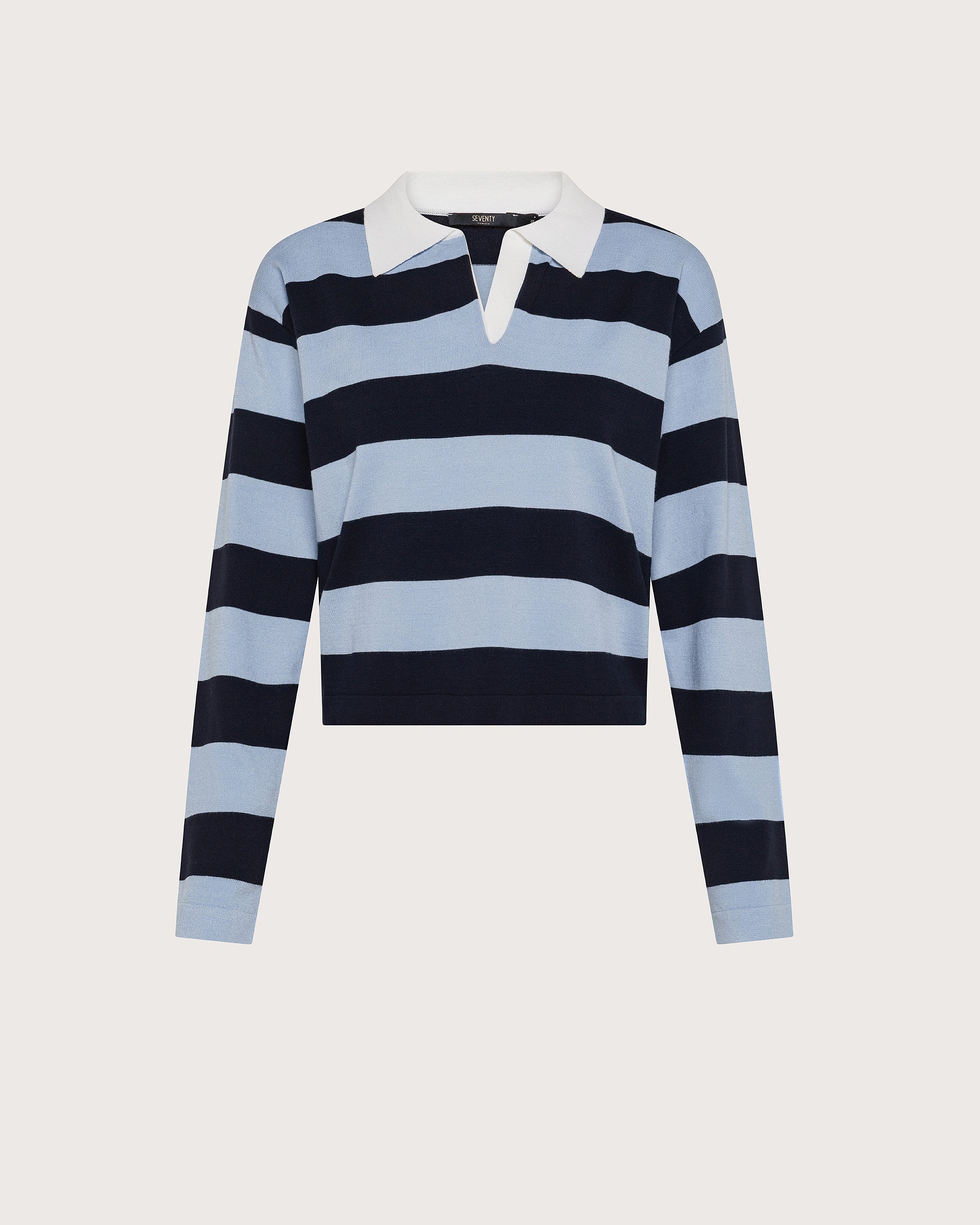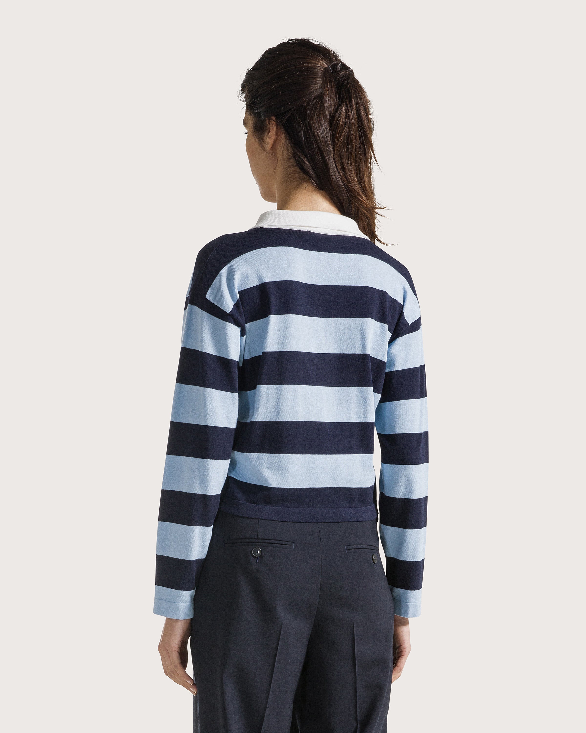 Polo manica lunga in viscosa riga rugby con collo bianco in contrasto.