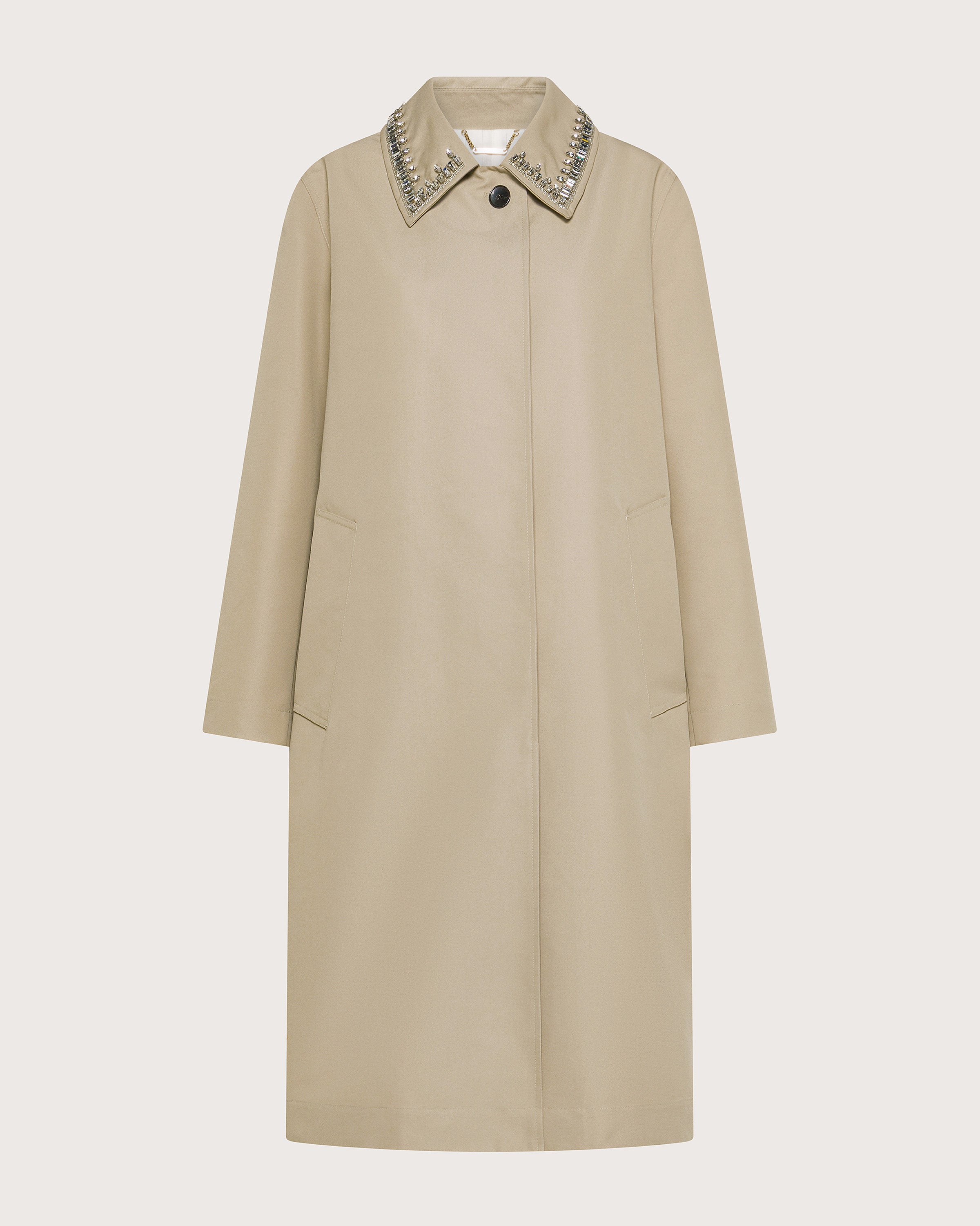 Trench in cotone con bottoni coperti e dettaglio accesssorio pietre nel collo.
