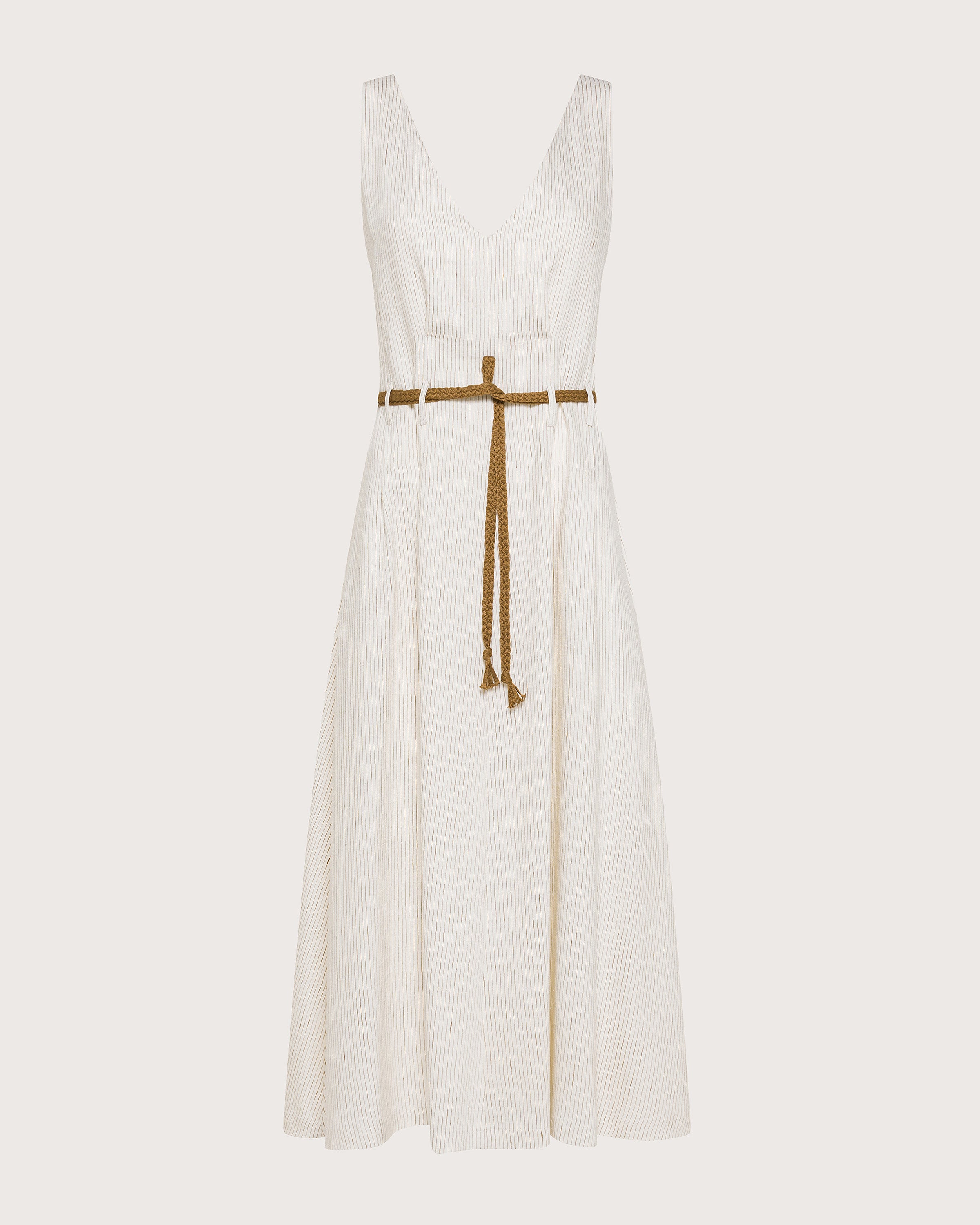 Abito smanicato midi in lino rigato con ampio scollo a V e cinturino in vita amovibile.