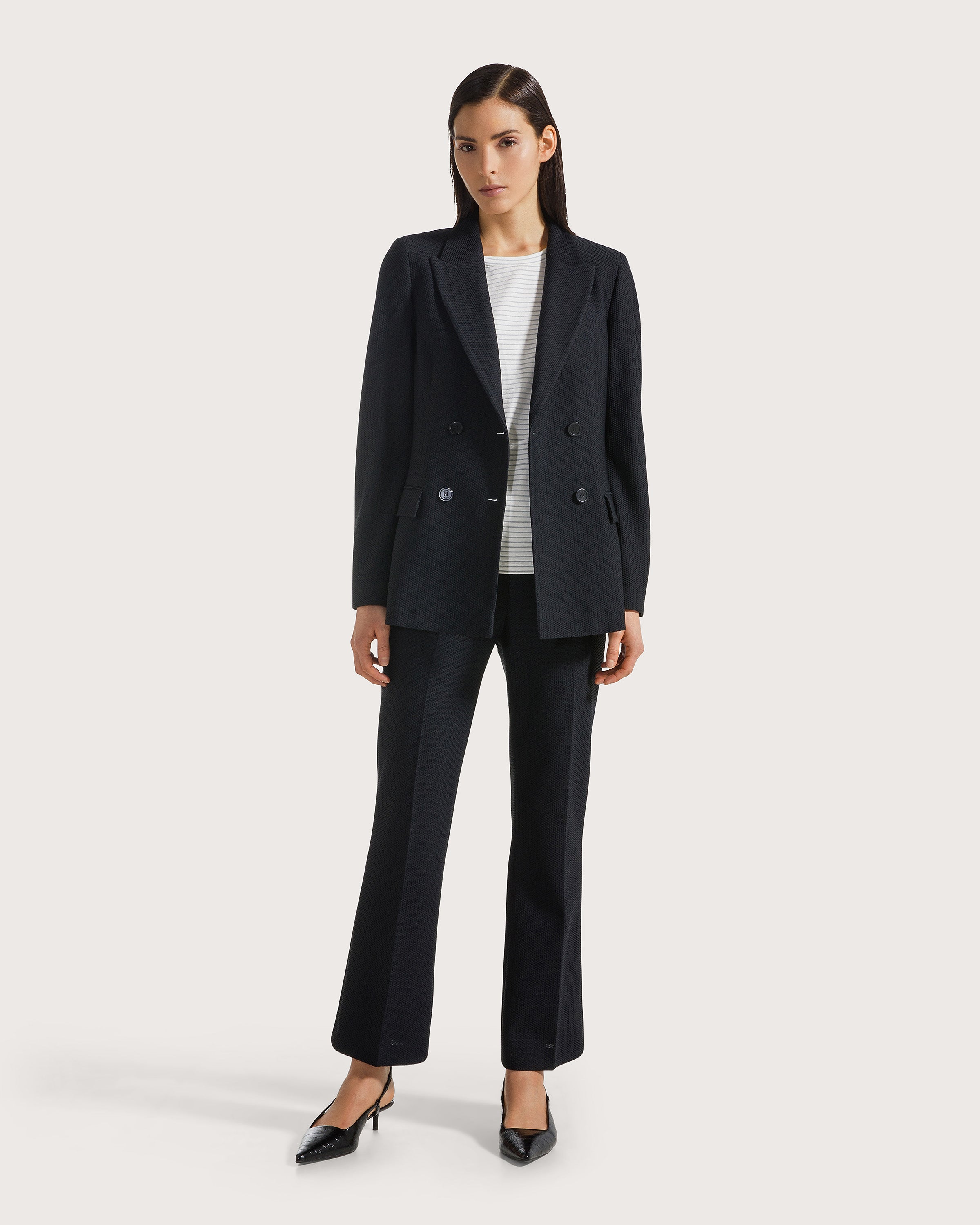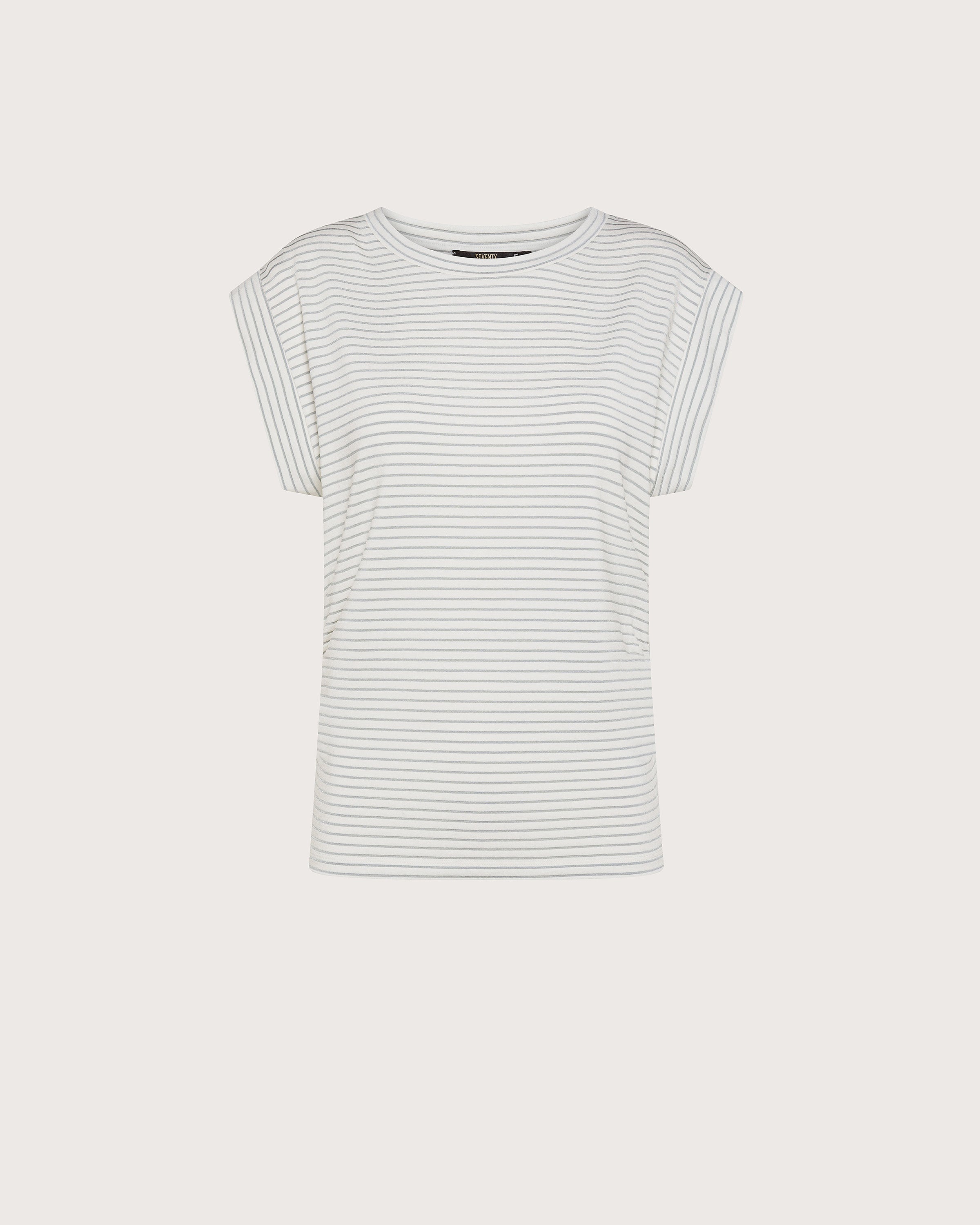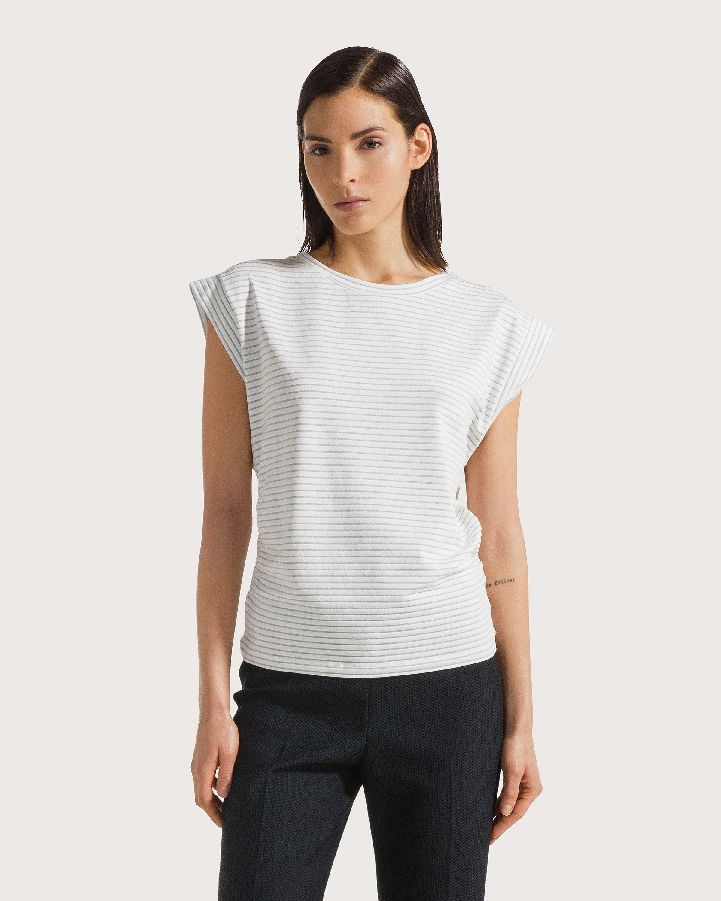 Maglia manica arondine in viscosa righetta bistertch. Dettaglio arricio sul fianco.