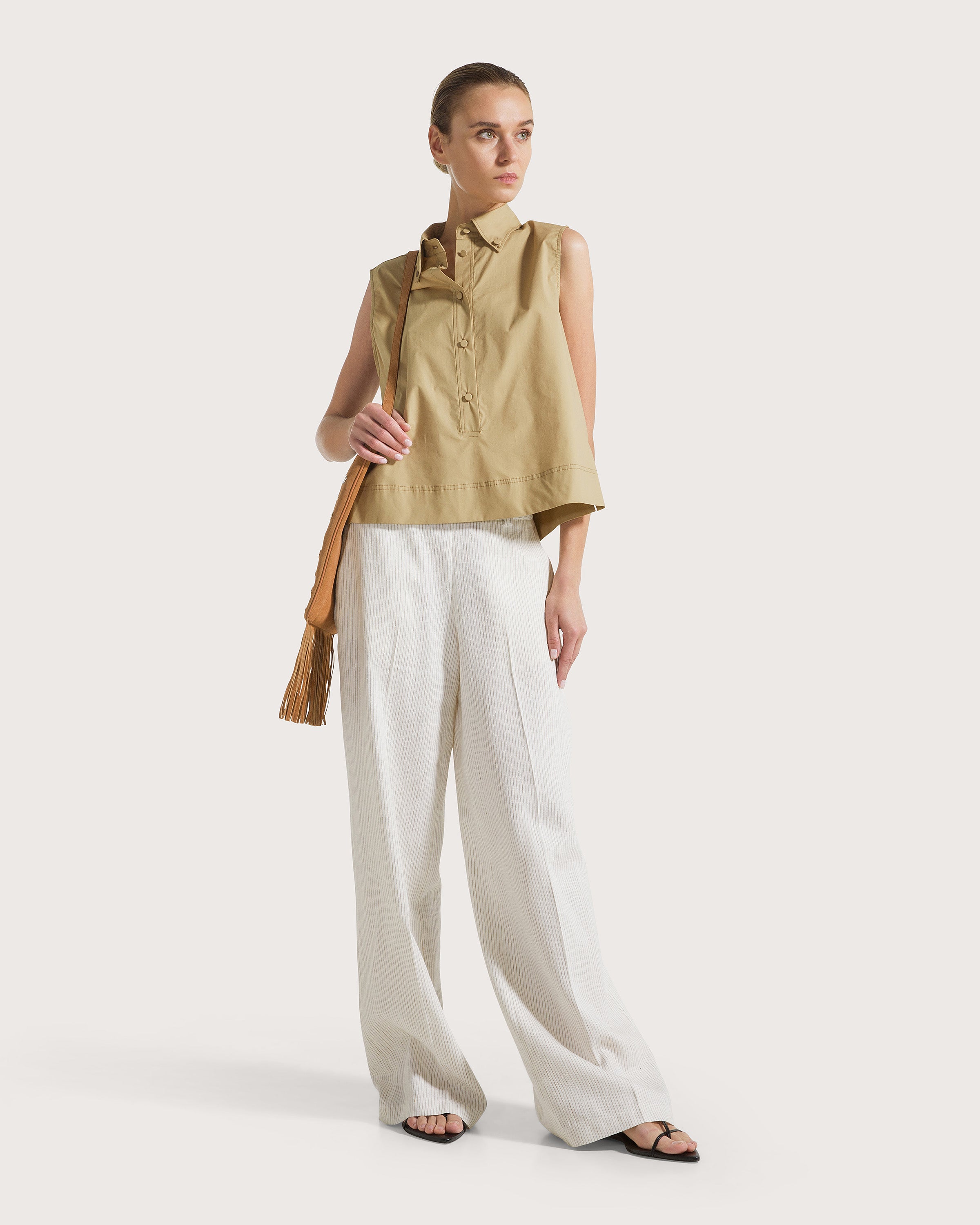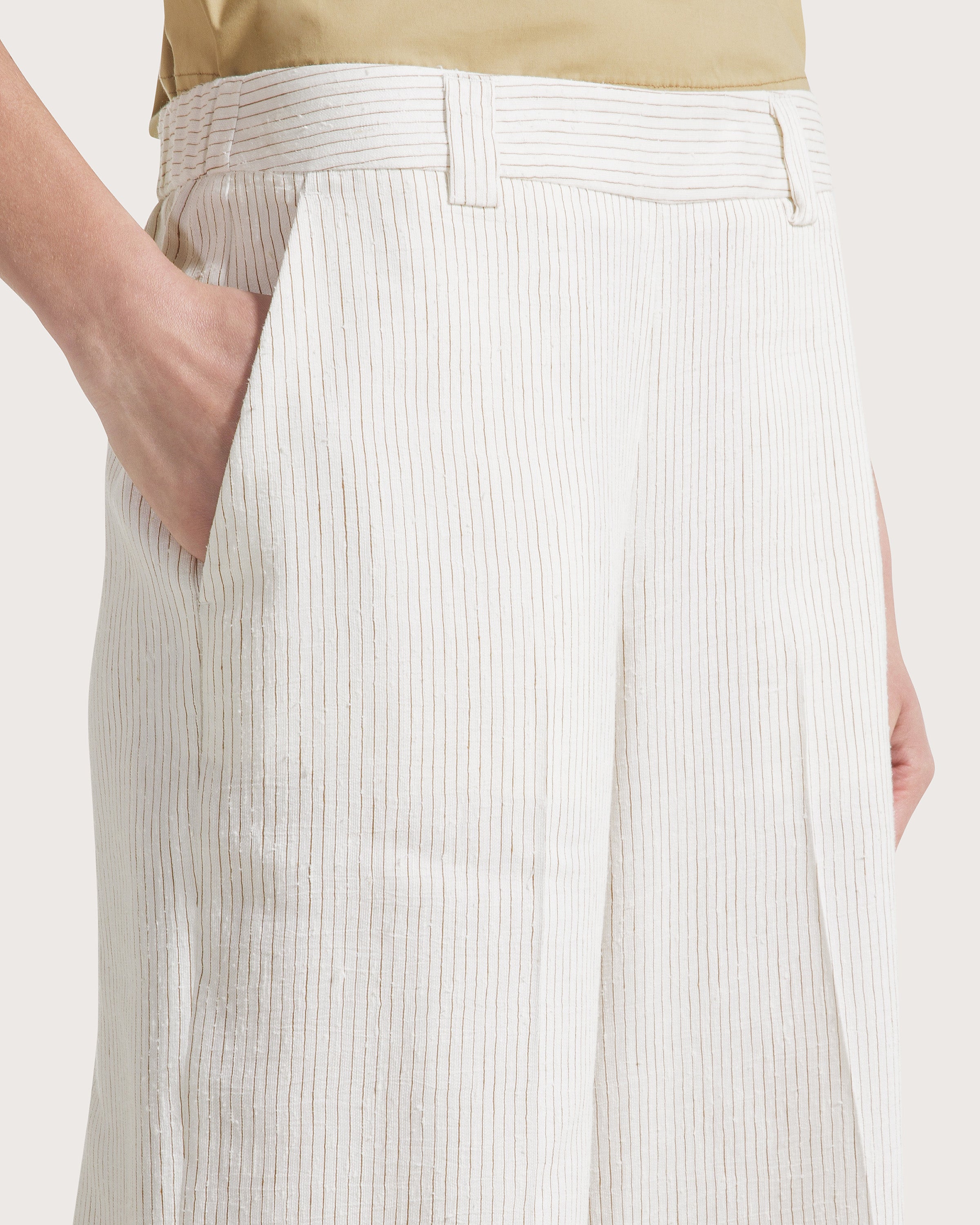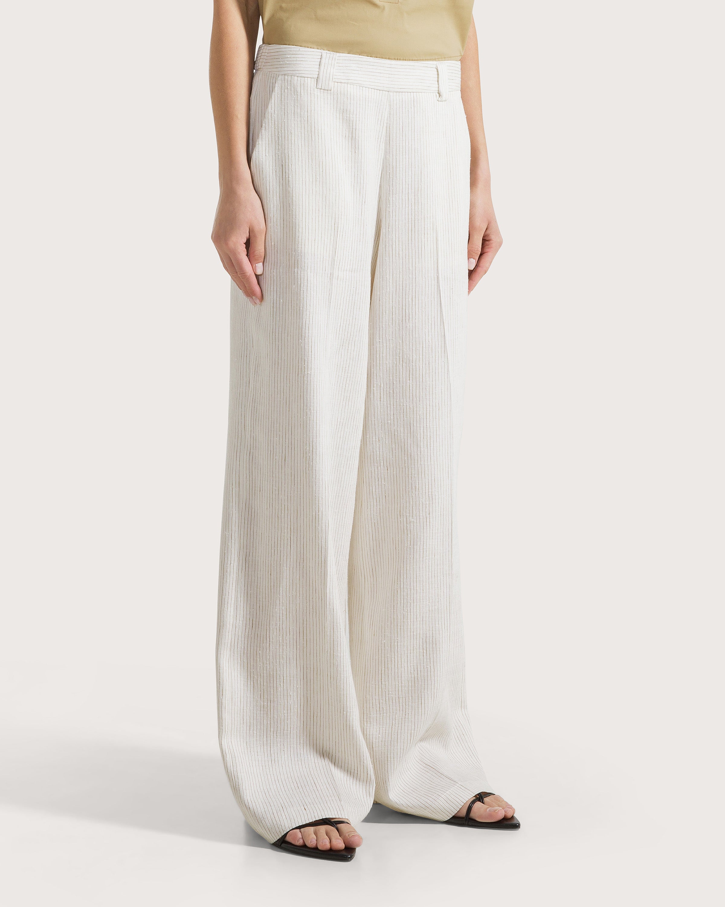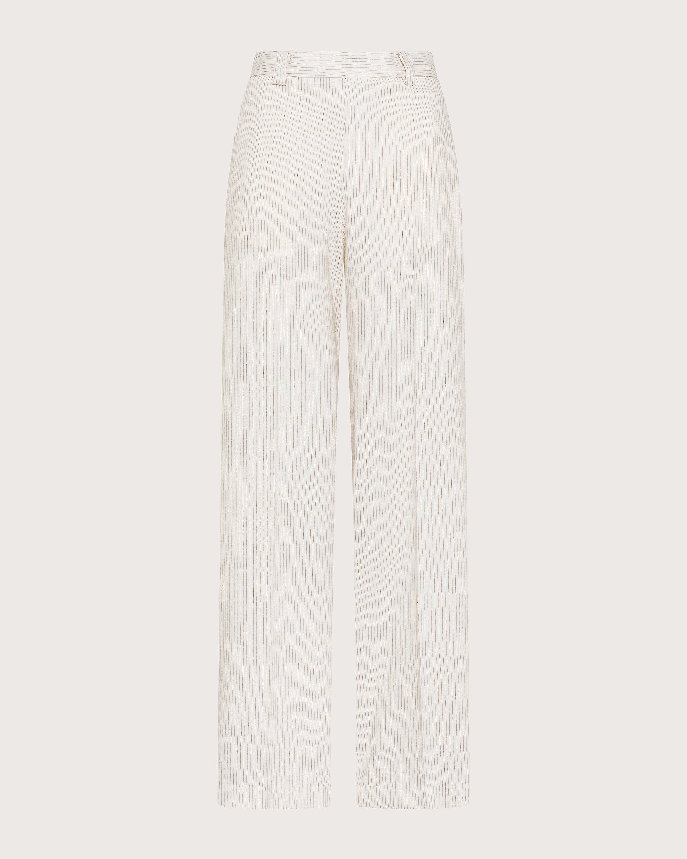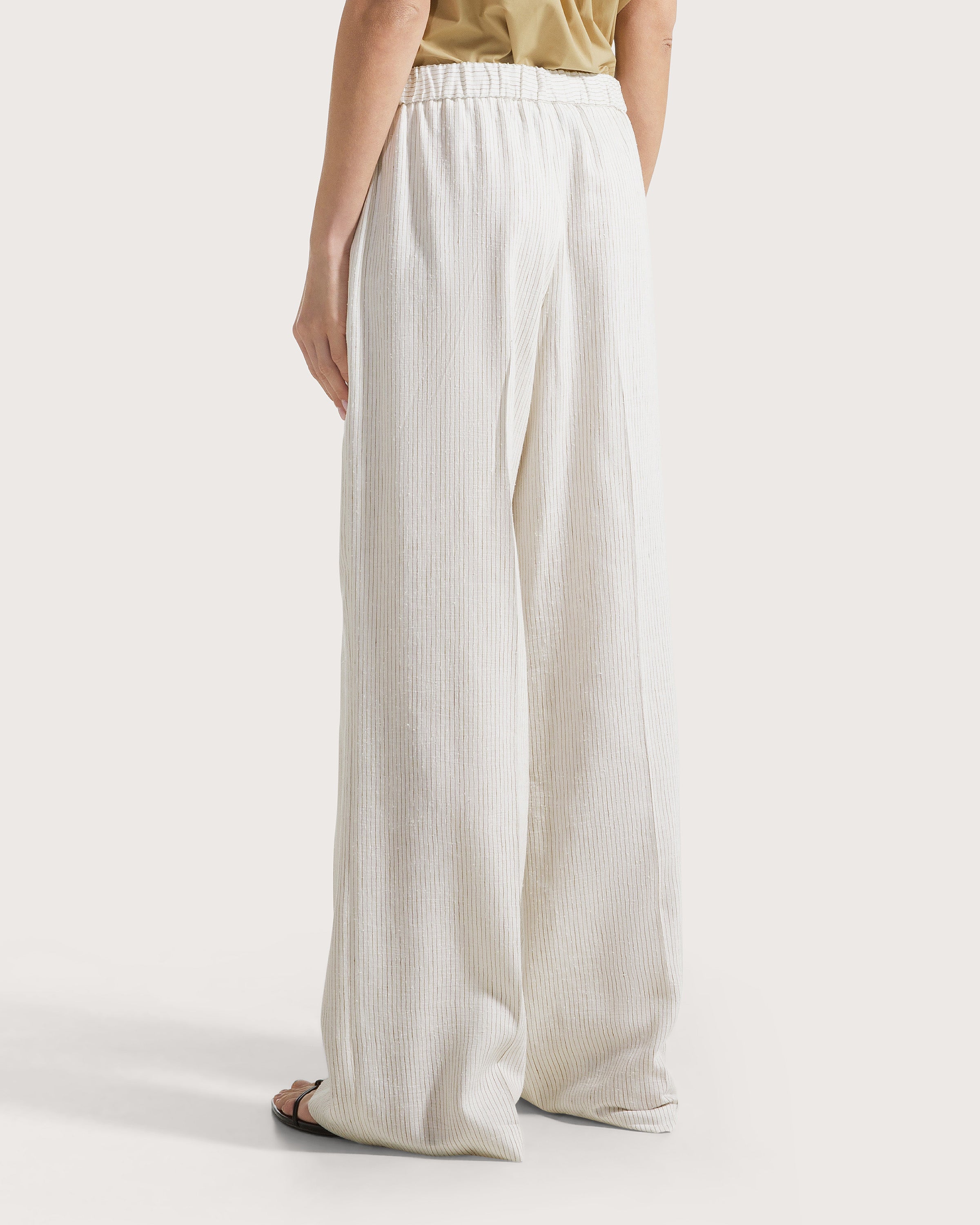 Pantalone ampio in misto lino rigato con elastico sul retro e cintura piatta frontale con tasche laterali .