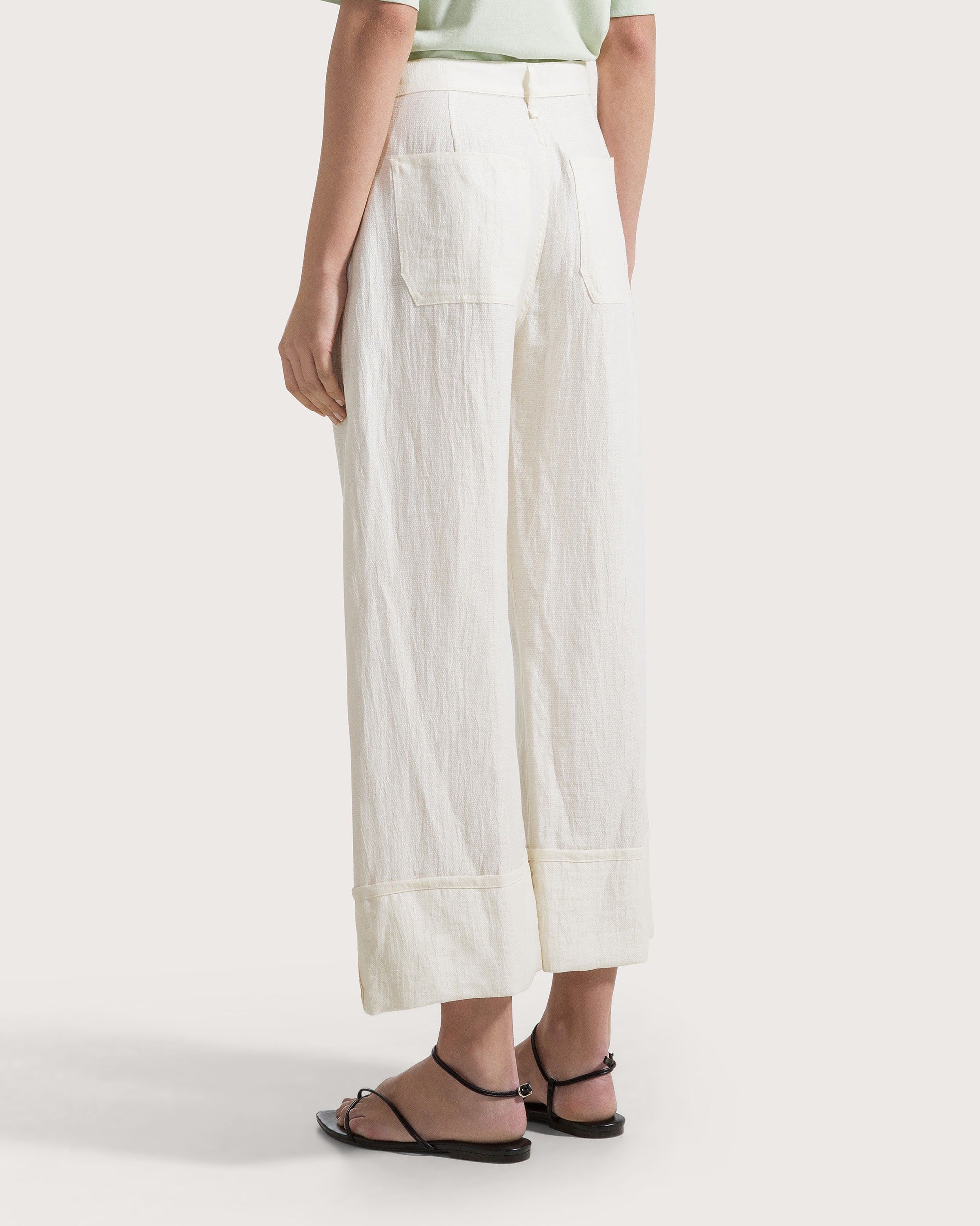 Pantalone misto lino stroppicciato con maxi risvolto al fondo e cimosa.