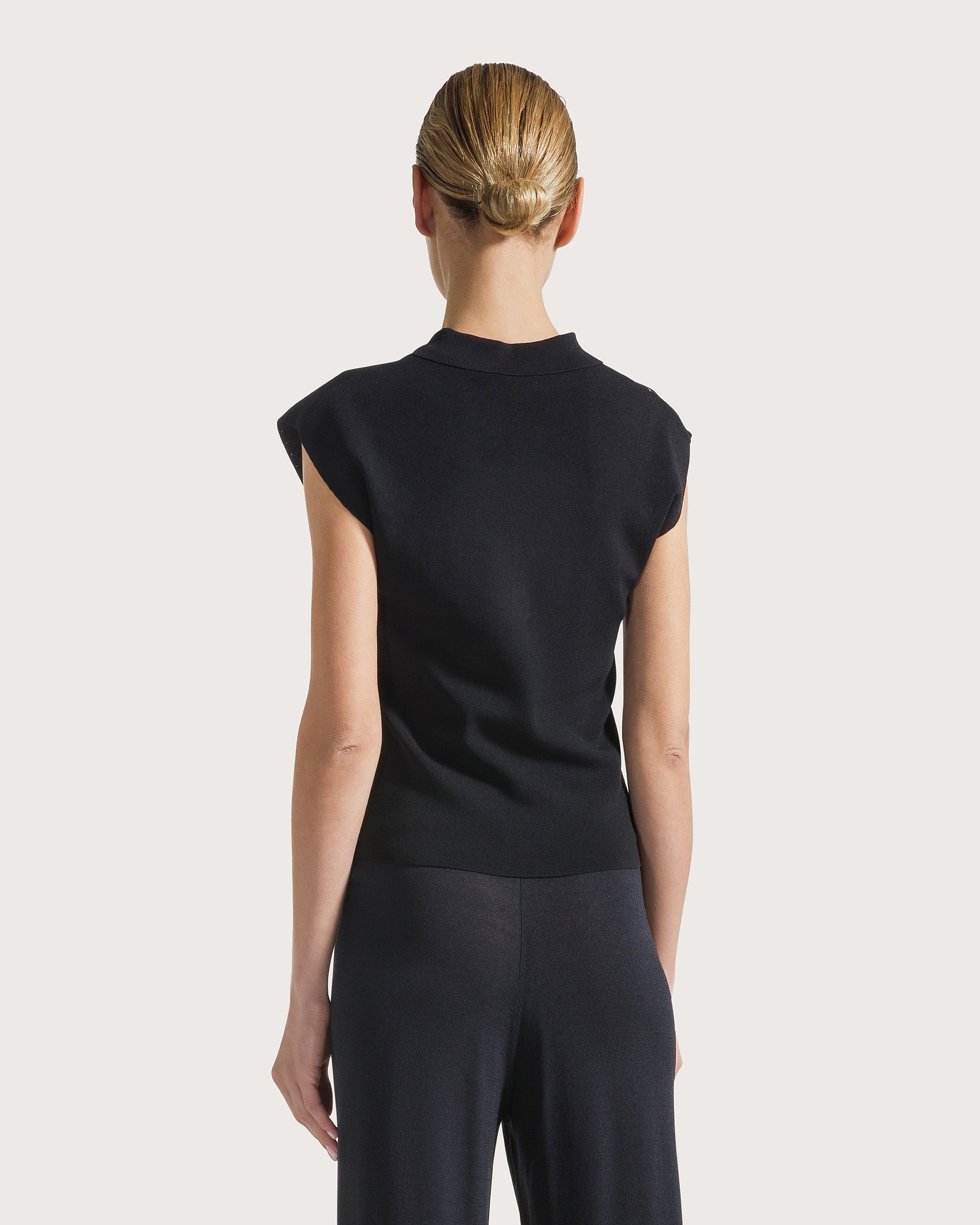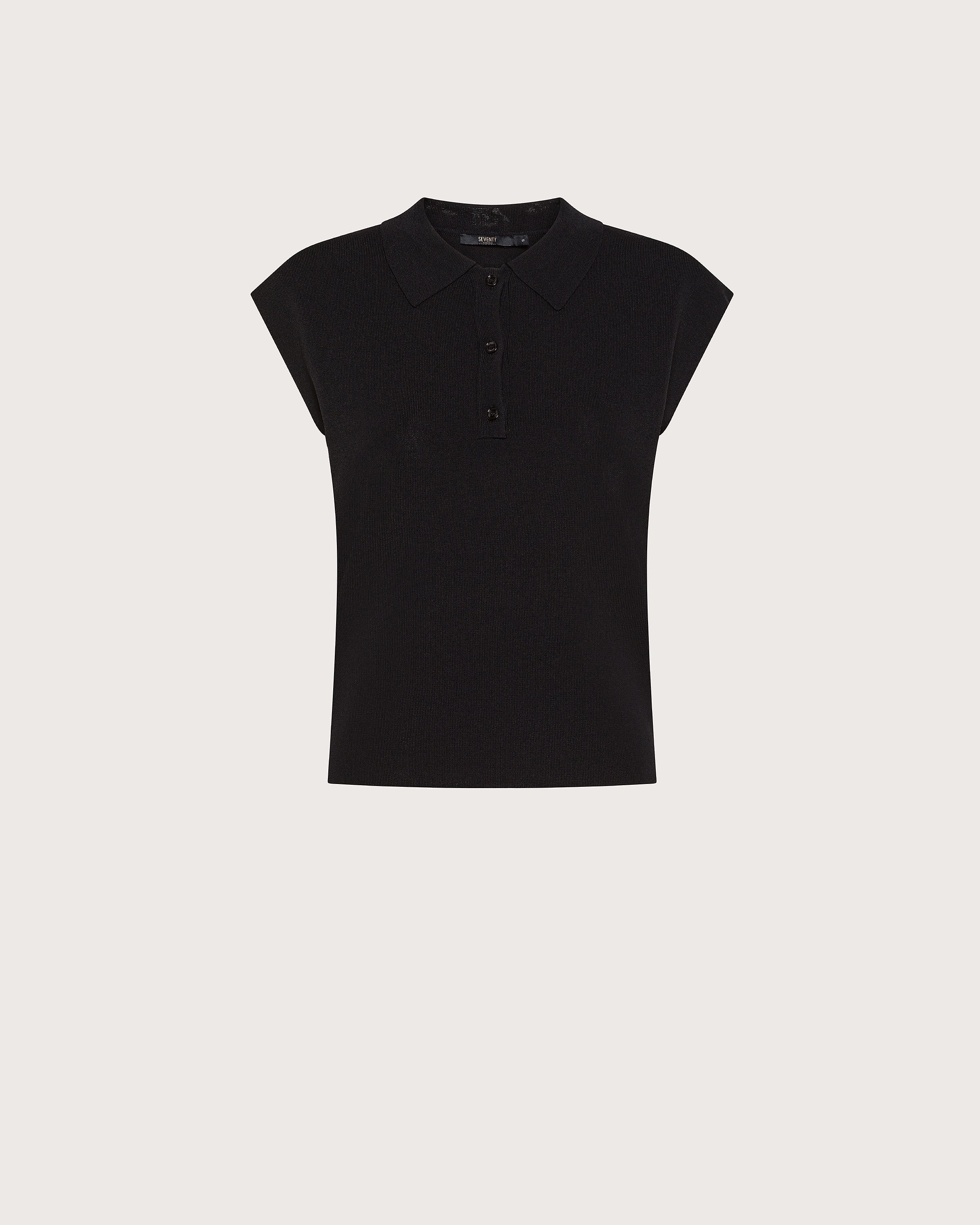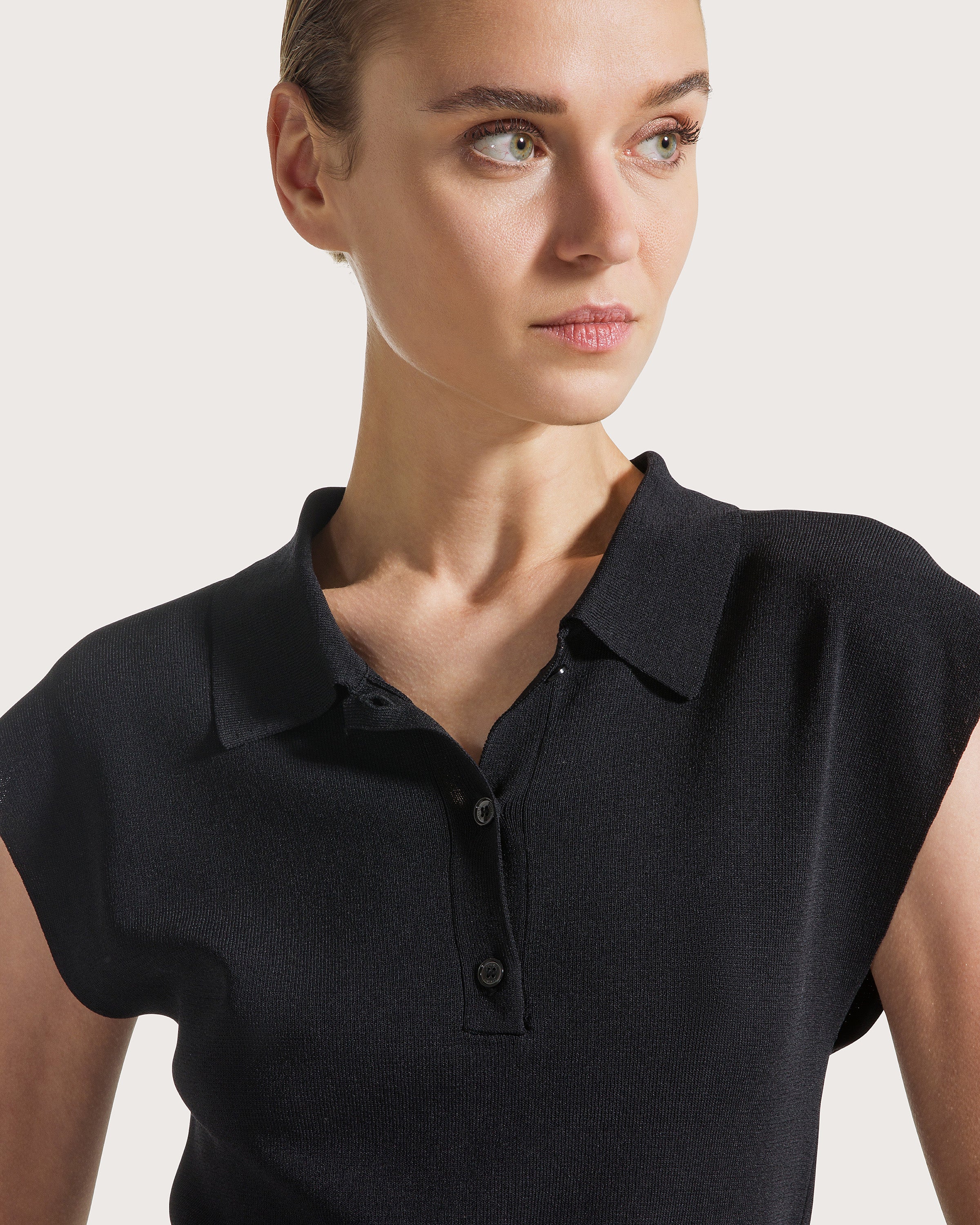 Polo smanicata in viscosa punto tessuto con vestibilità slim.