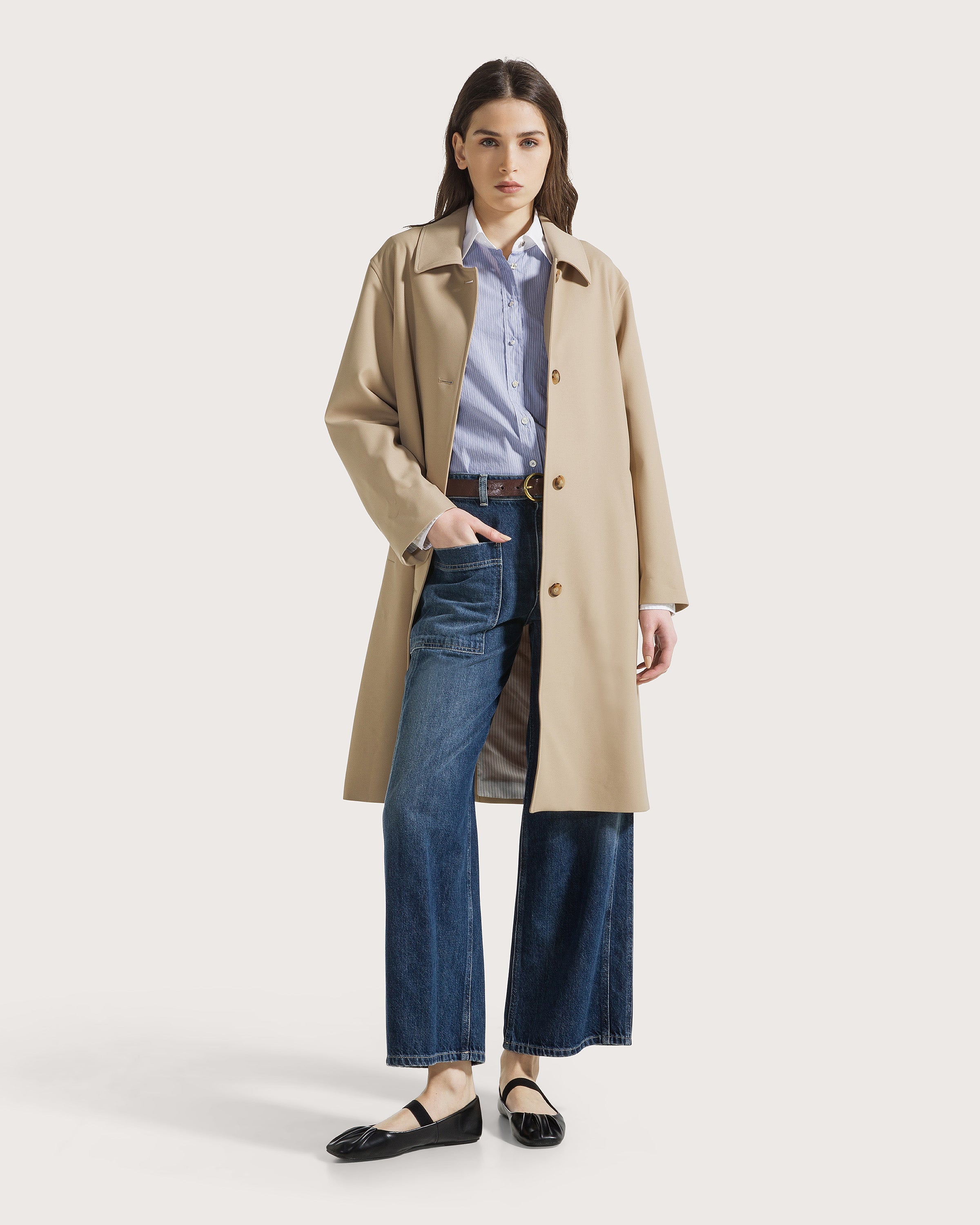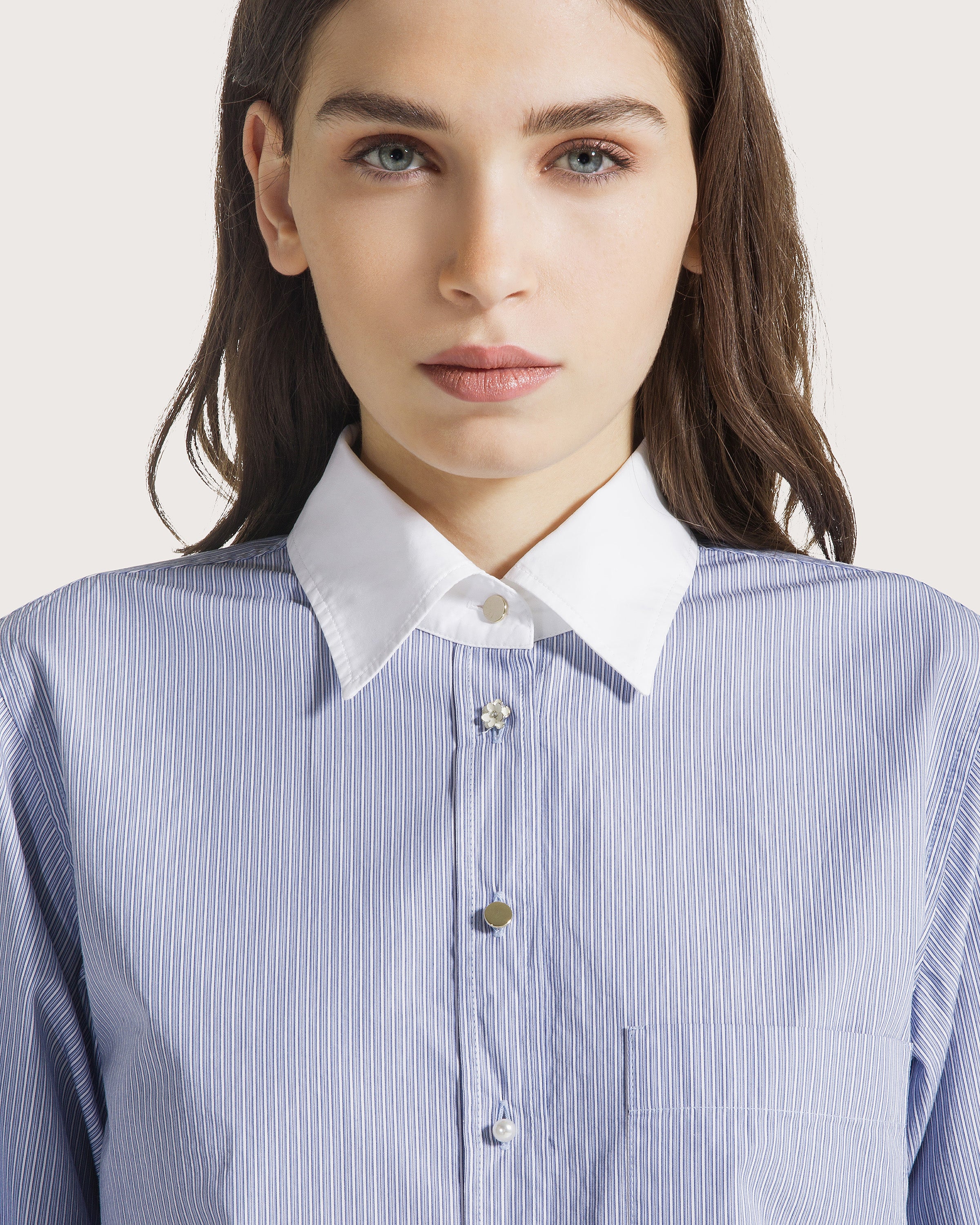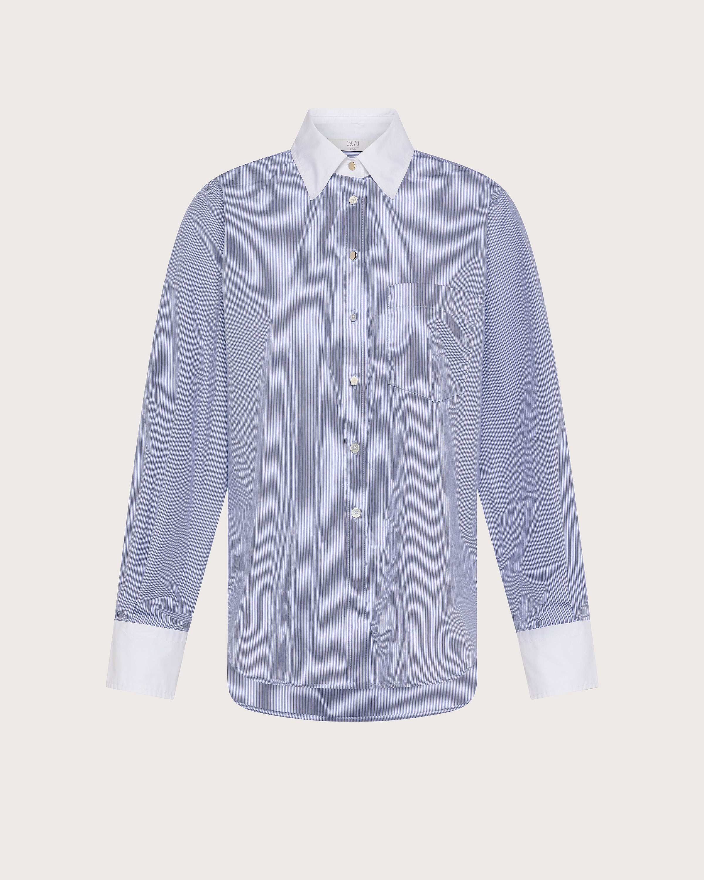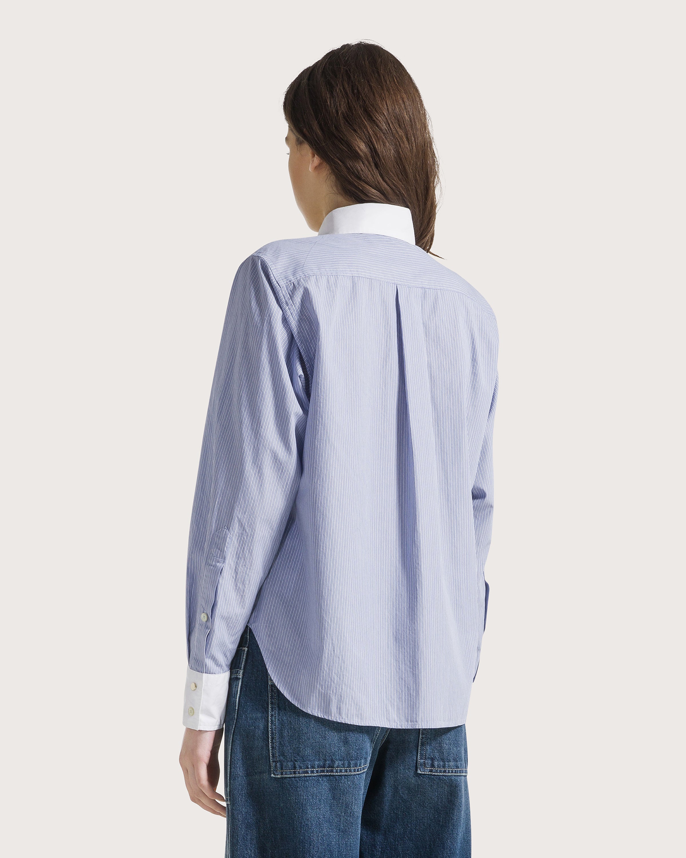 Camicia in cotone tinto filo a righe con dettaglio collo e polsini a contrasto tinta unita. Chiusura con bottoni differenziati.