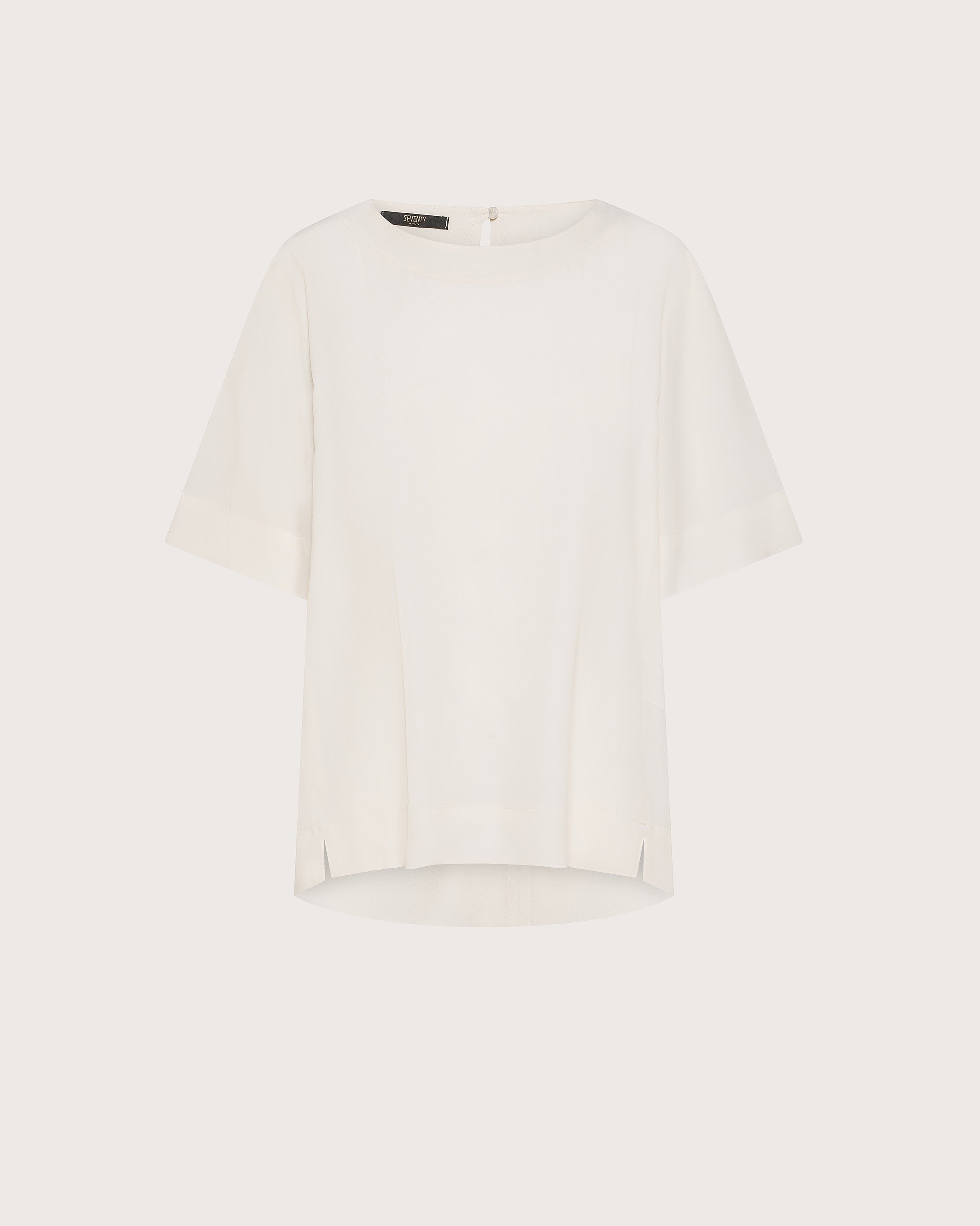 Casacca girocollo mezza manica in crêpe misto seta con dettaglio piccolo spacco laterale sul fondo.
