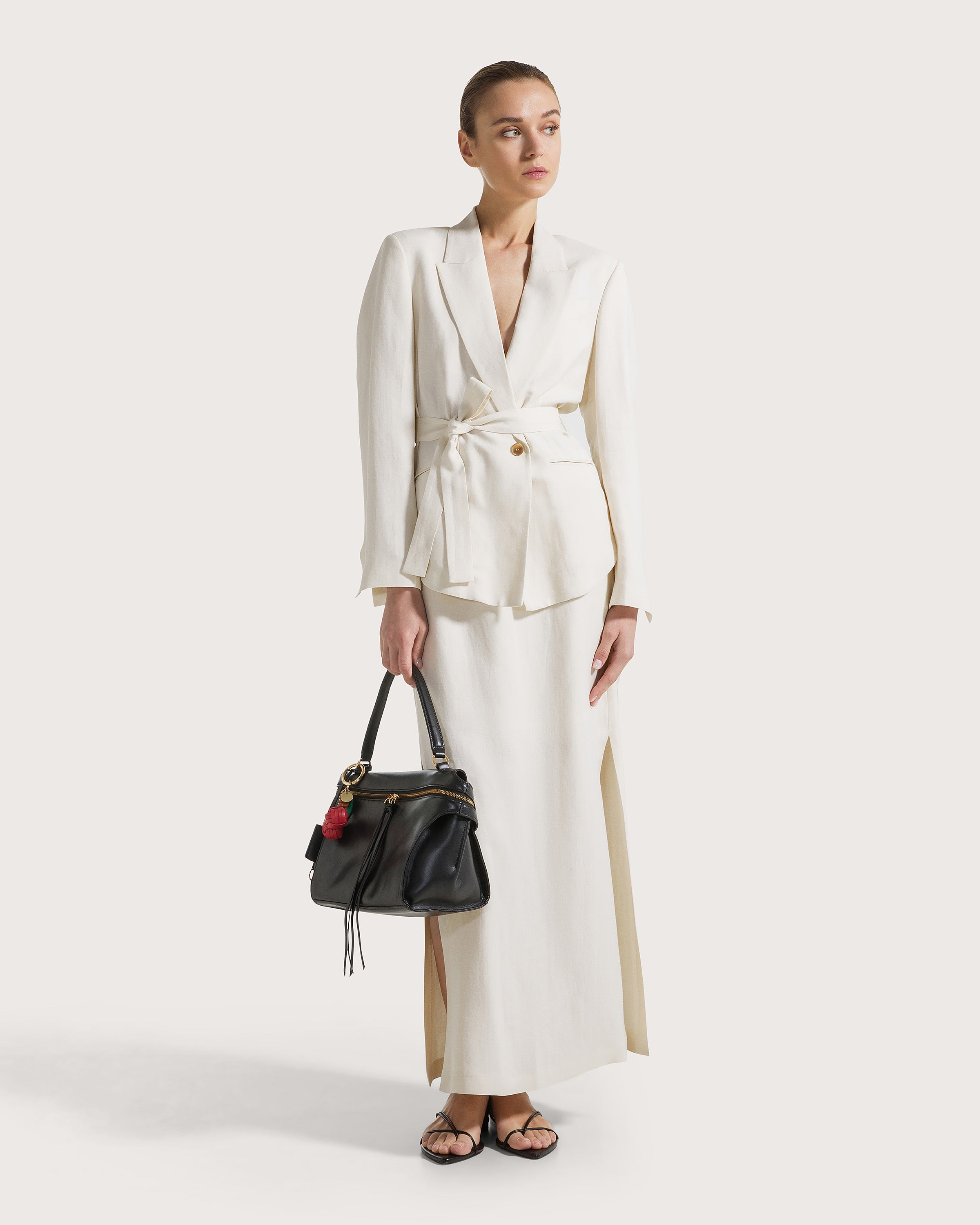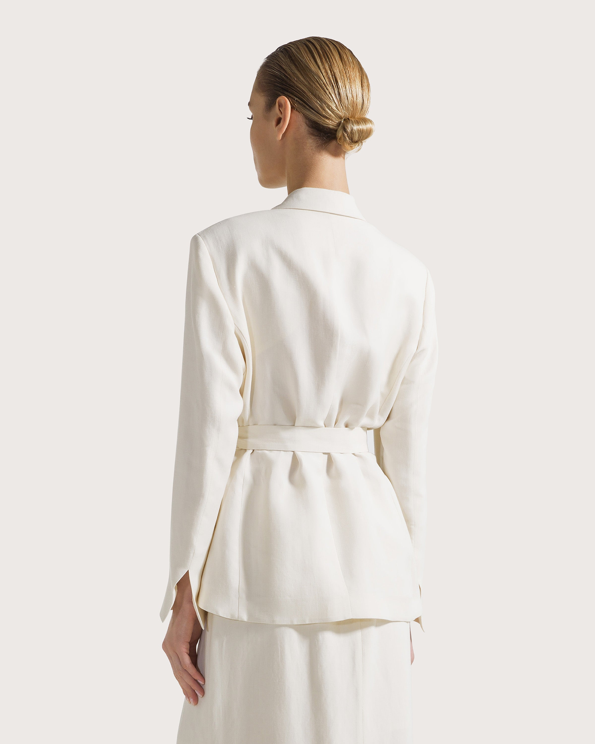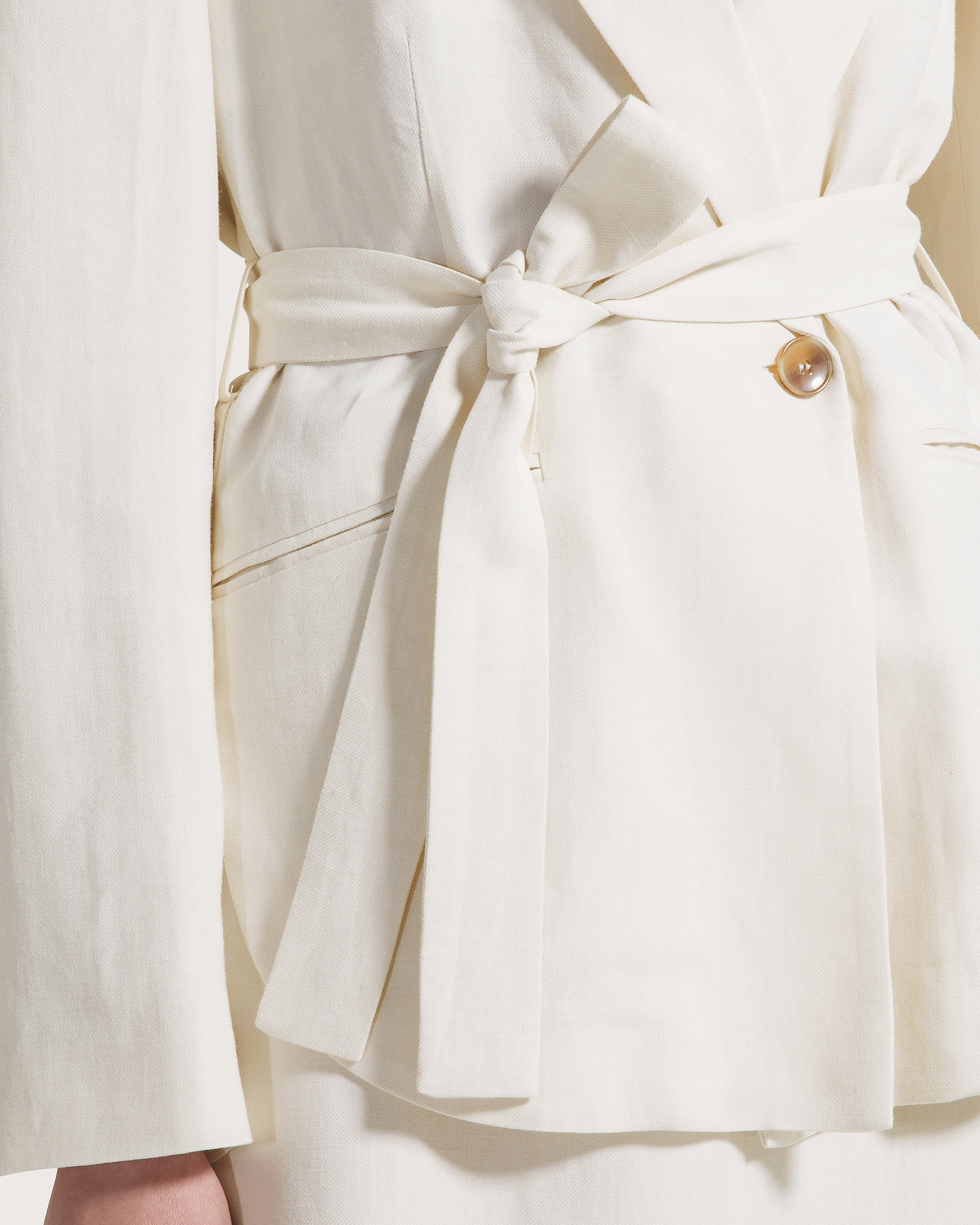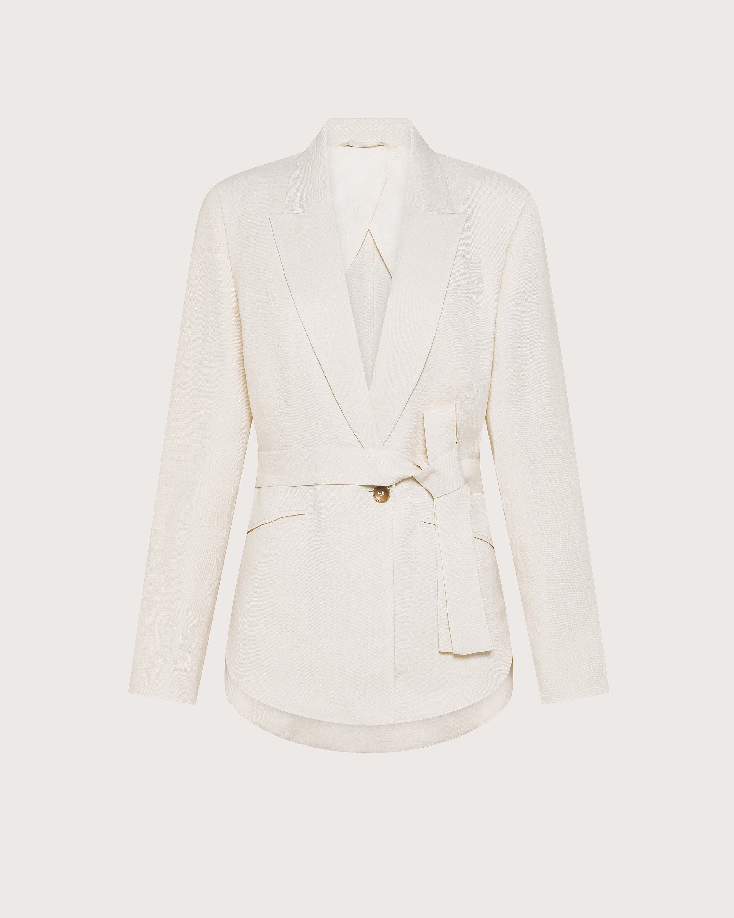 Giacca monopetto e rever a lancia in visicosa lino con fusciacca in vita. Tasche a filetto e spacchi laterali.