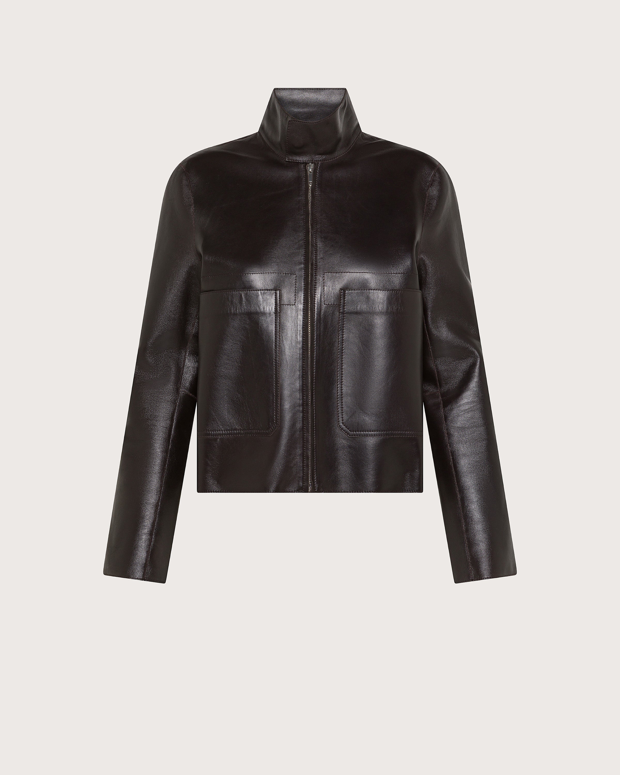 Giubbotto corto in pelle leggera, chiusura a zip e a ampie tasche frontali.