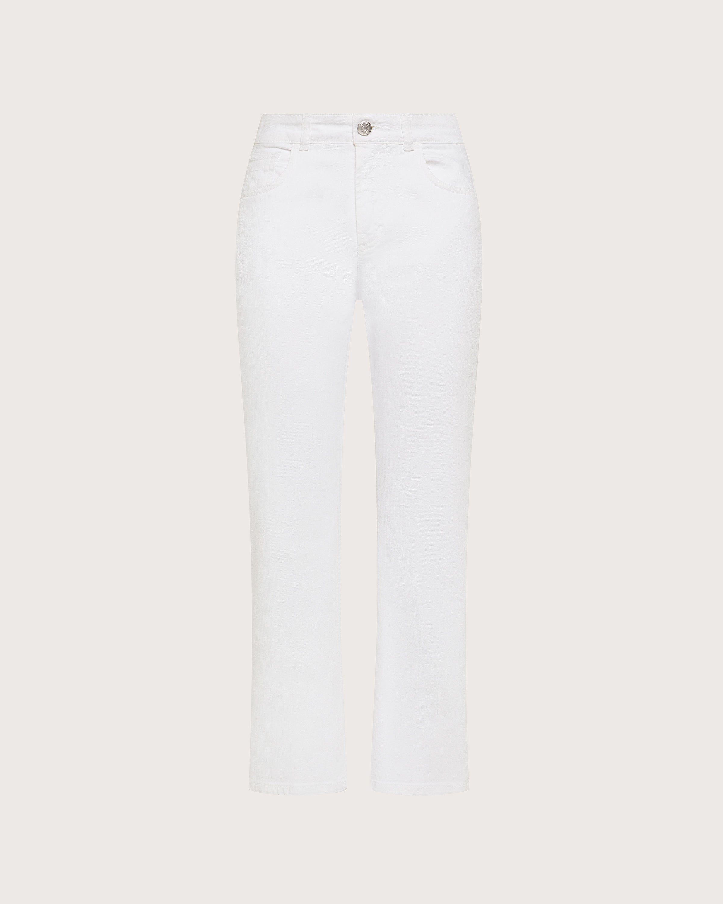 Jeans in bull di cotone stretch tinto capo con fondo leggermente a zampa alla caviglia. Cinque tasche. Chiusura frontale con cerniera e bottone.