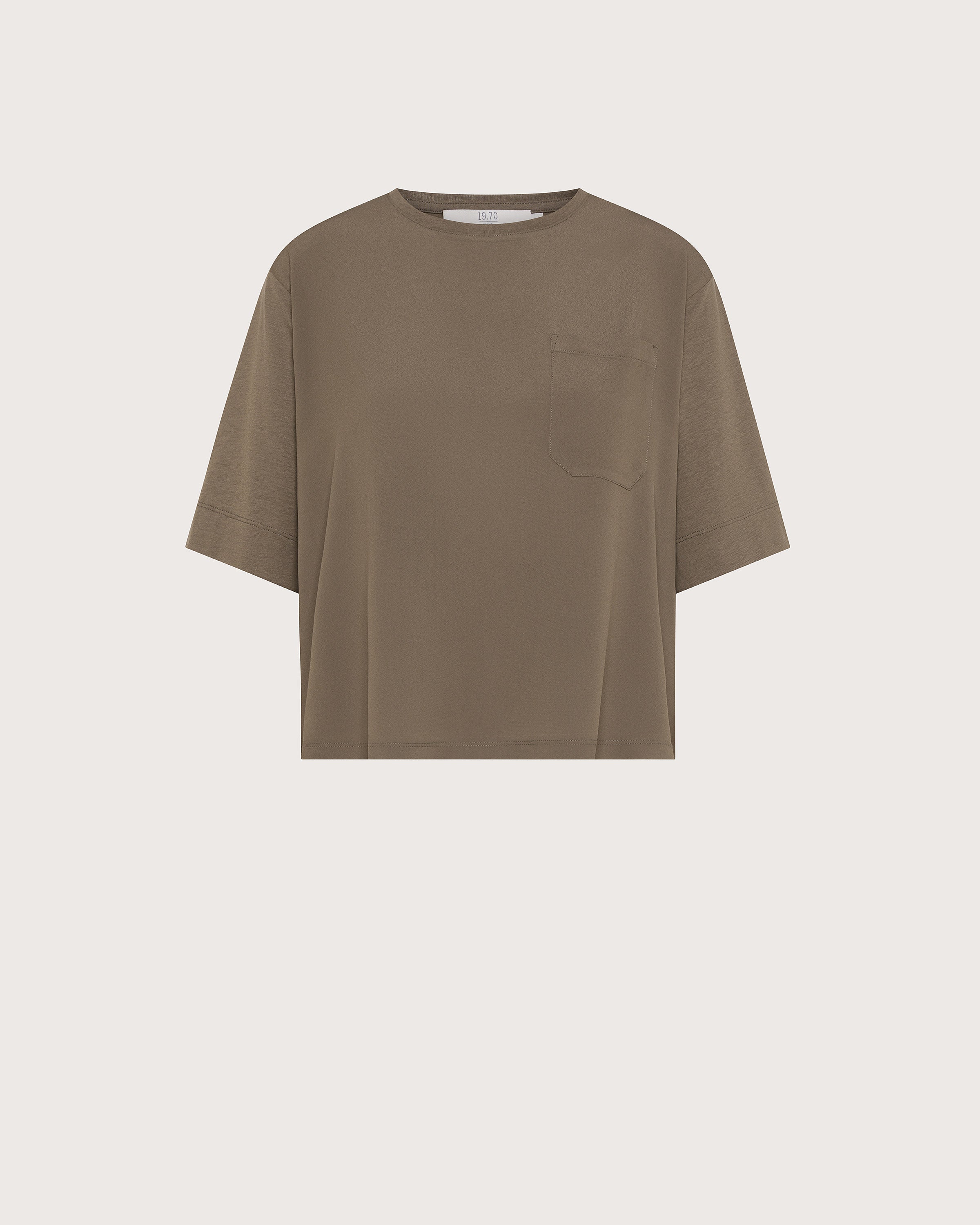 Maglia maniche 3/4 girocollo in jersey di cotone con dettagli in misto seta, vestibilità morbida e taschino.