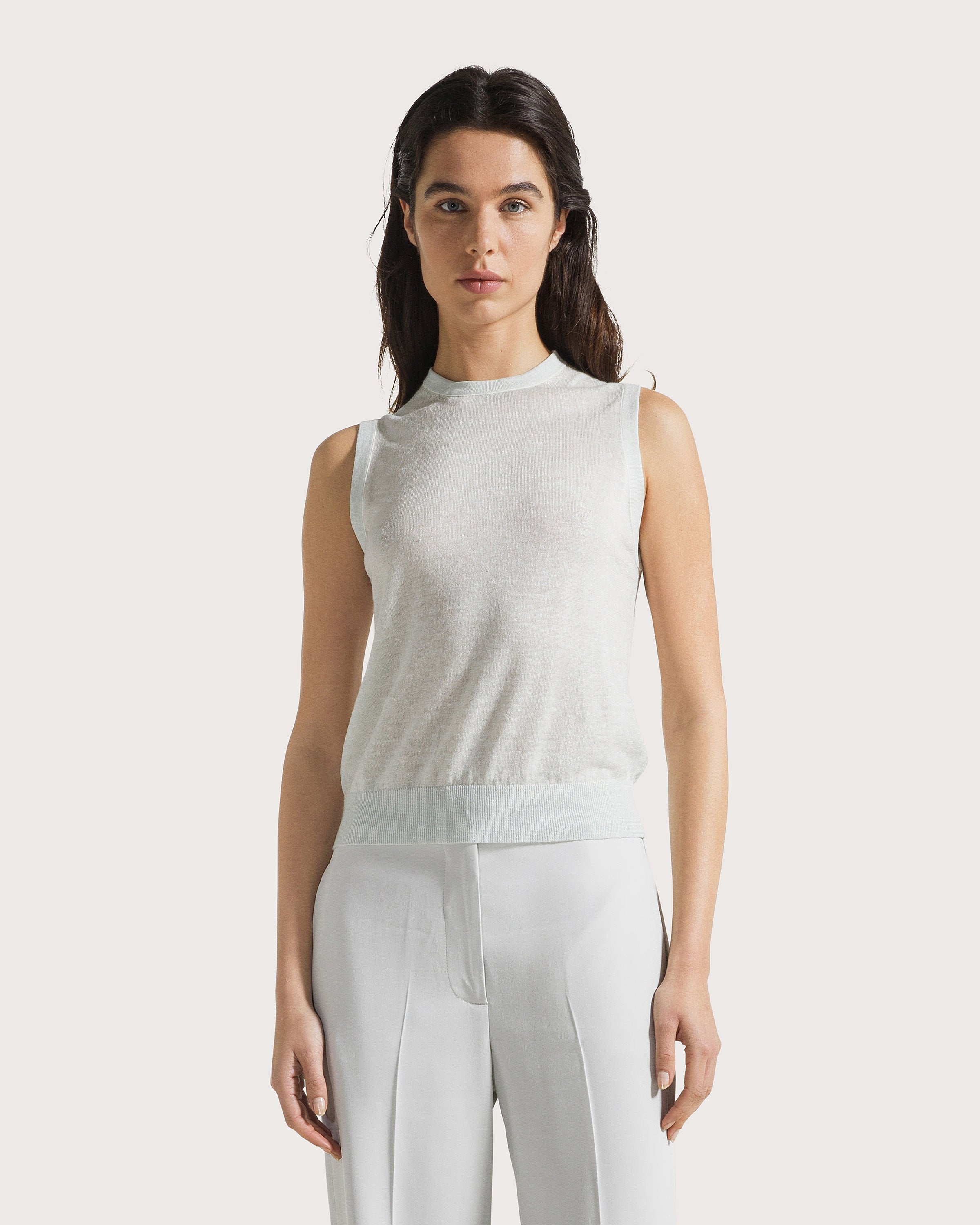 Maglia girocollo senza maniche in rasato di lana lino con profilatura e fondo manica smacchinata.