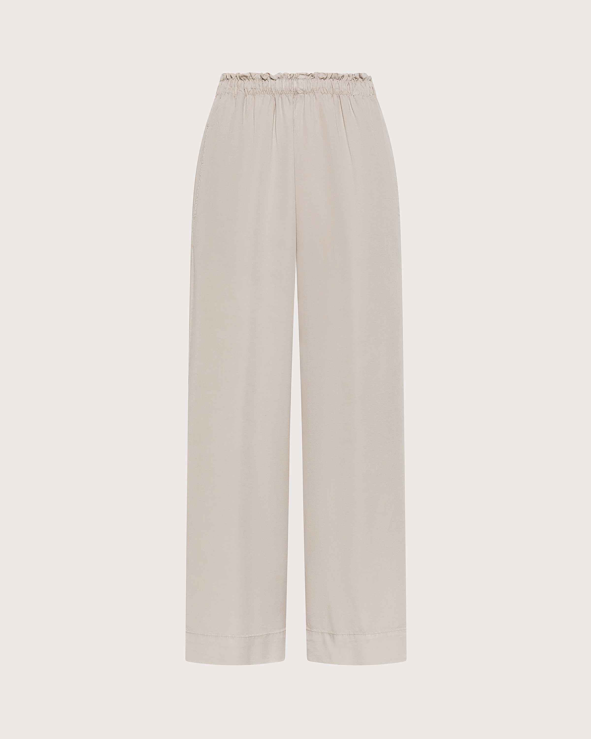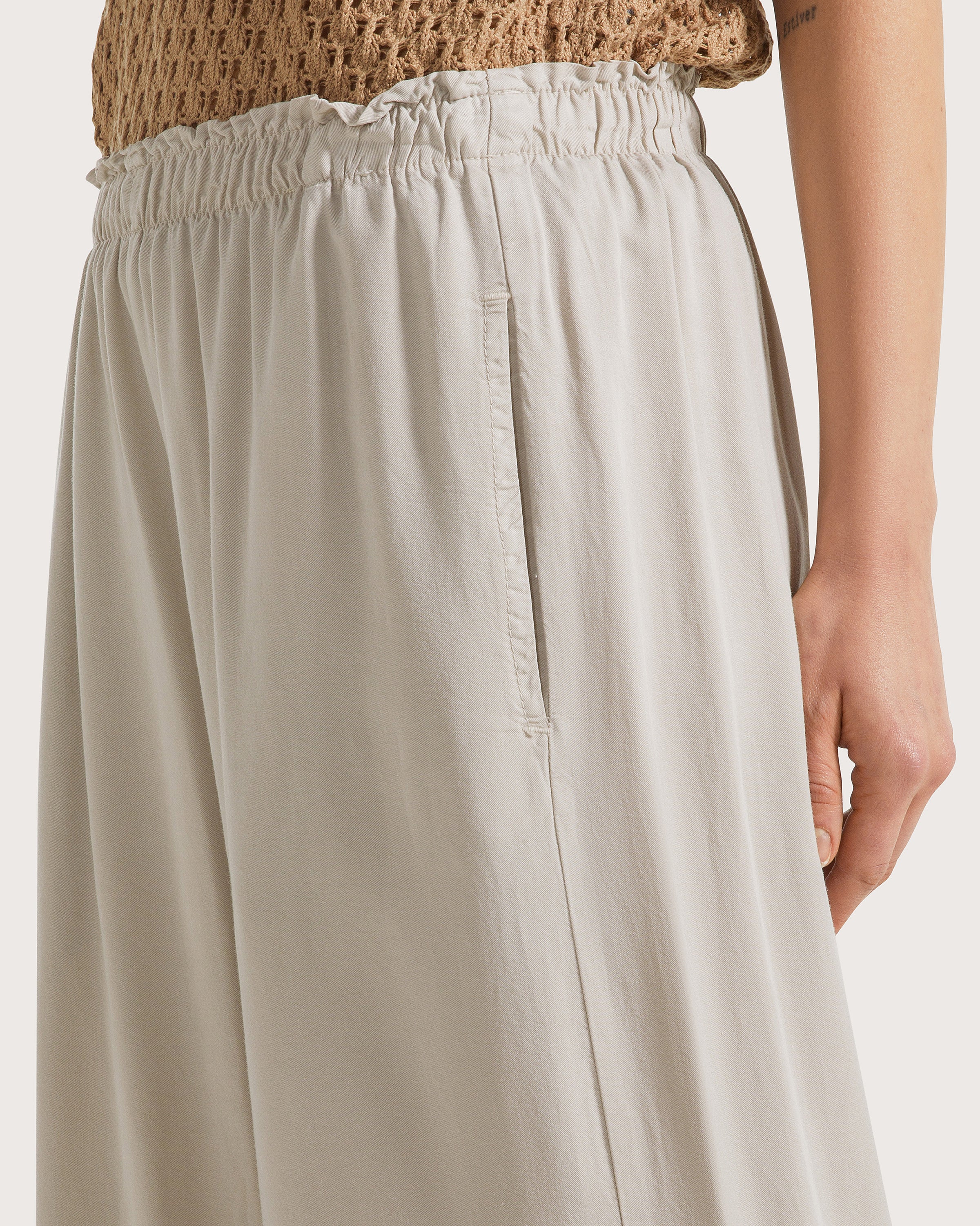 Pantalone elasticato in tela tencel tinto capo, vestibilità morbida e due tasche laterali.