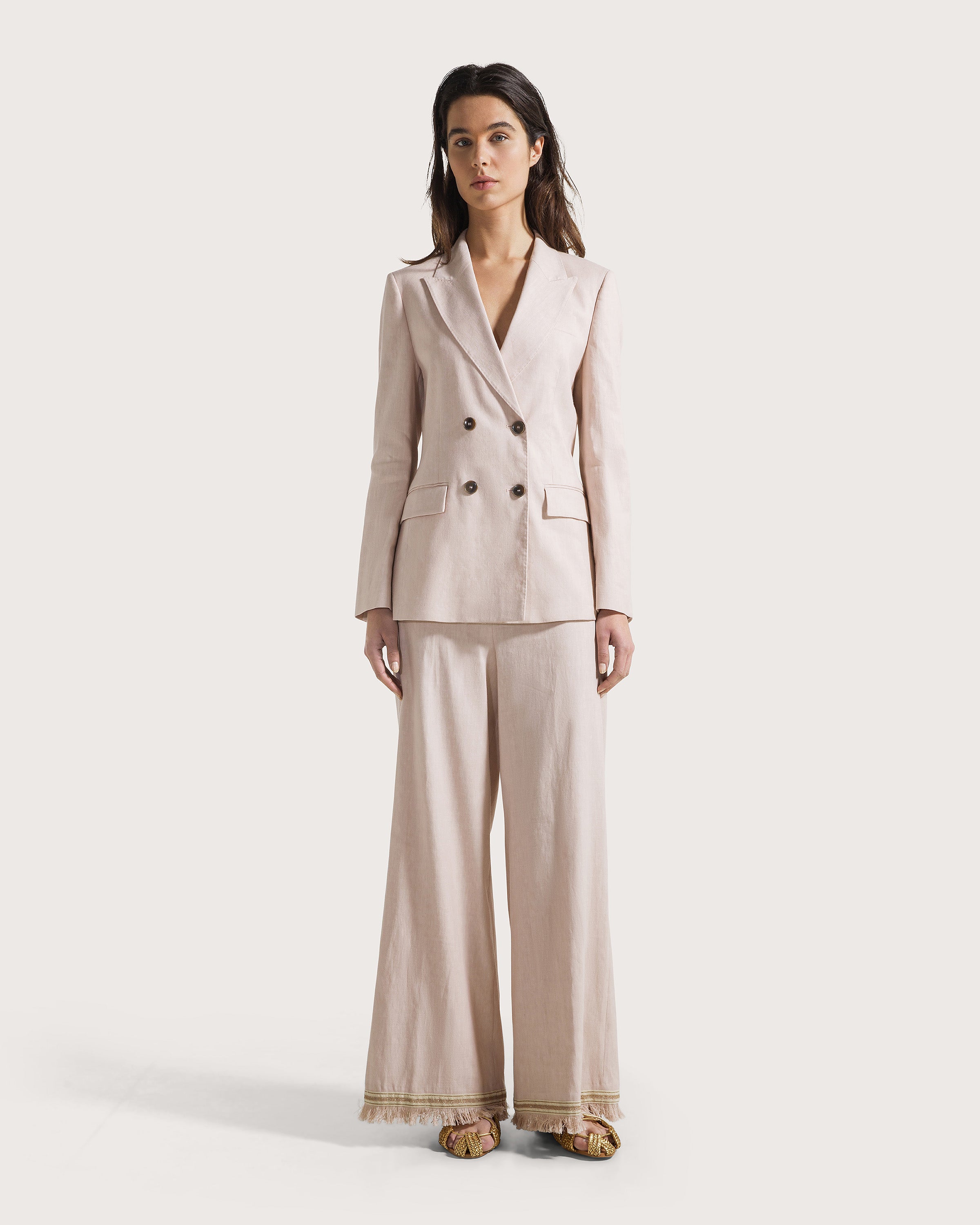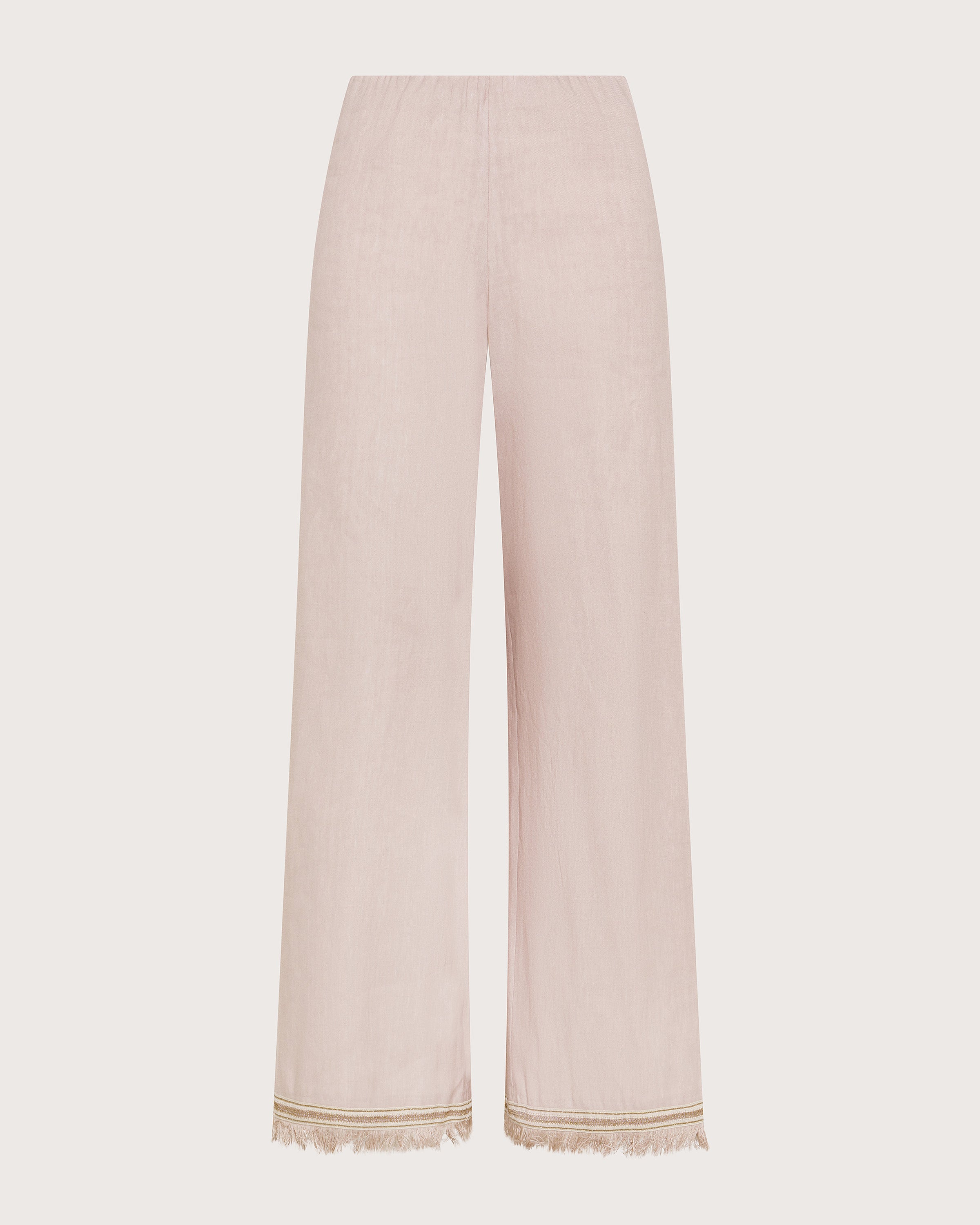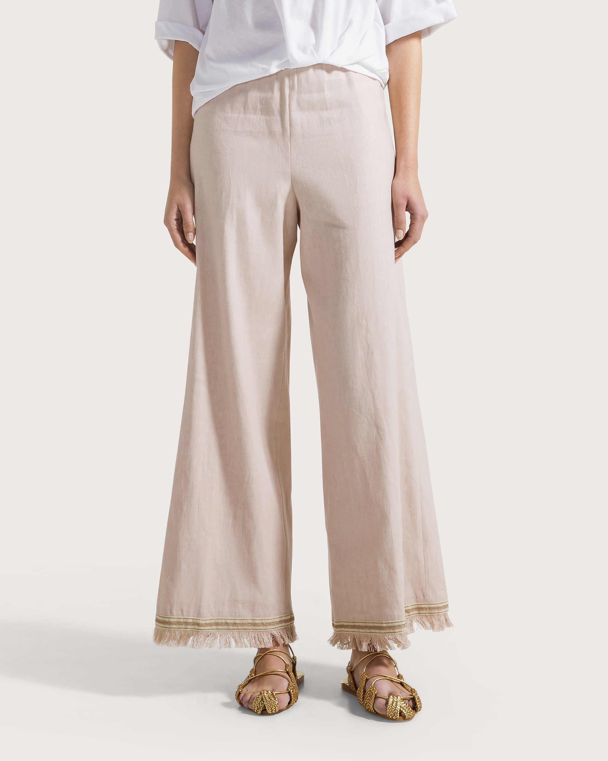 Pantalone lungo e gamba ampia in lino stretch, elasticato in vita. Dettaglio al fondo gamba in passamaneria e frange.