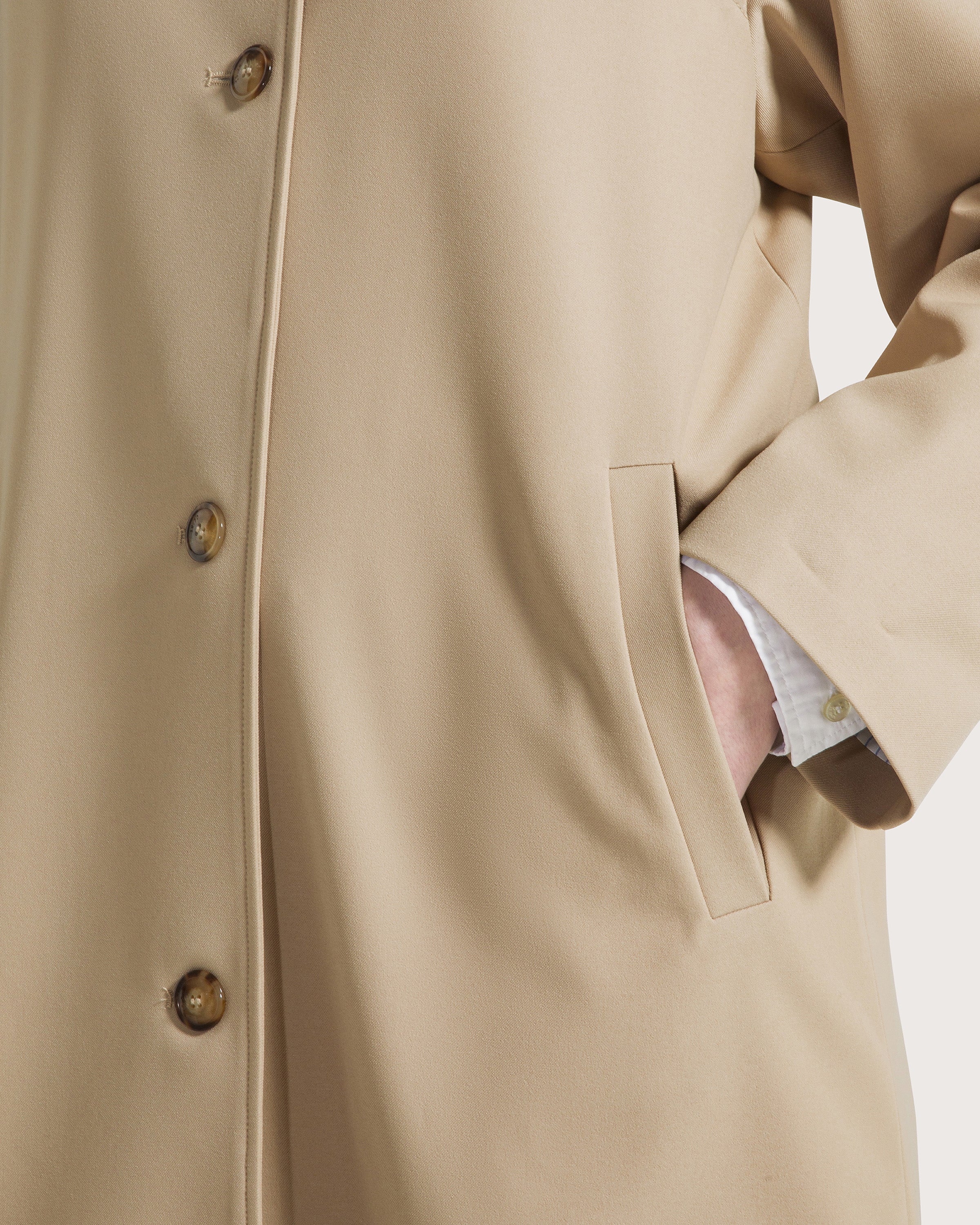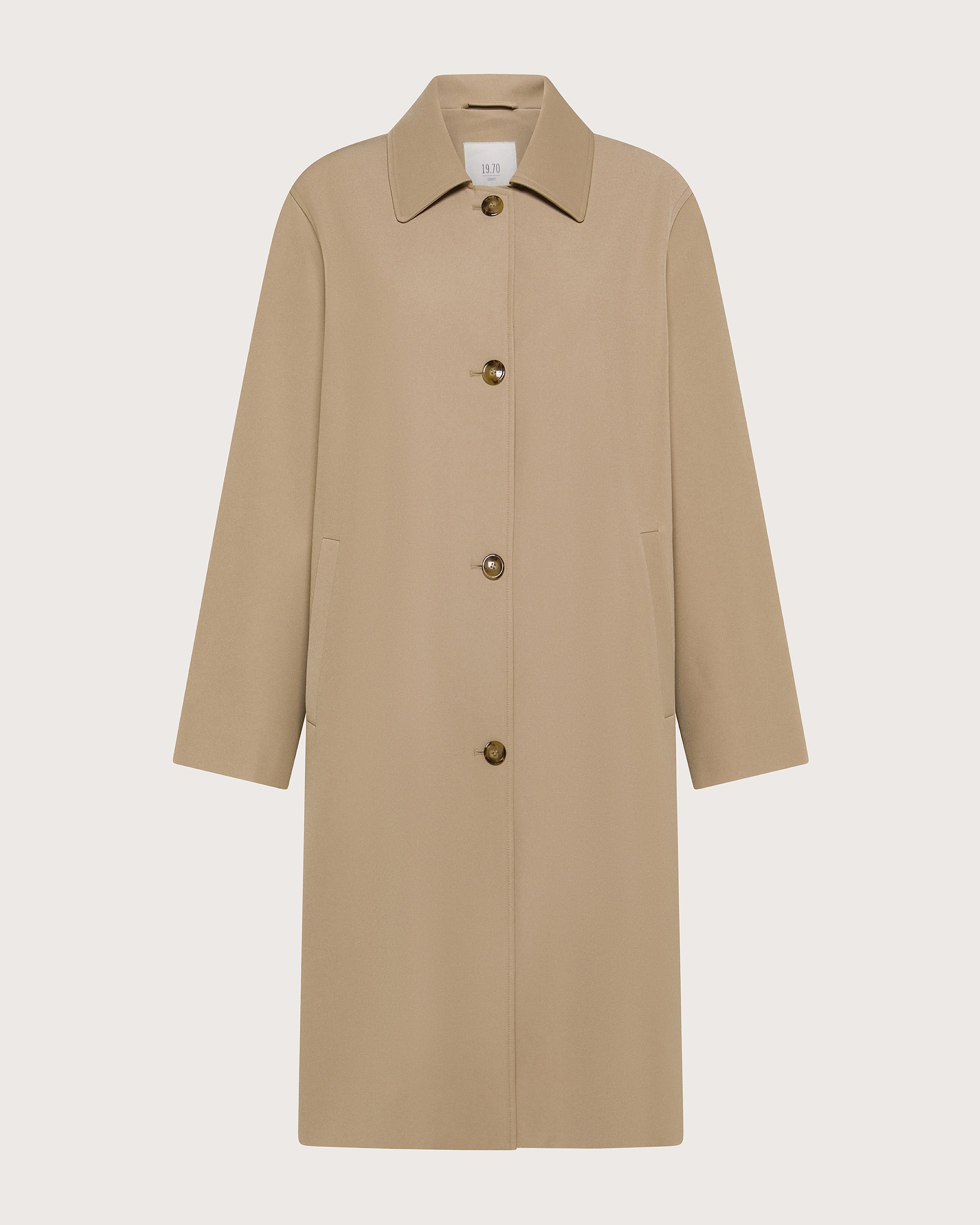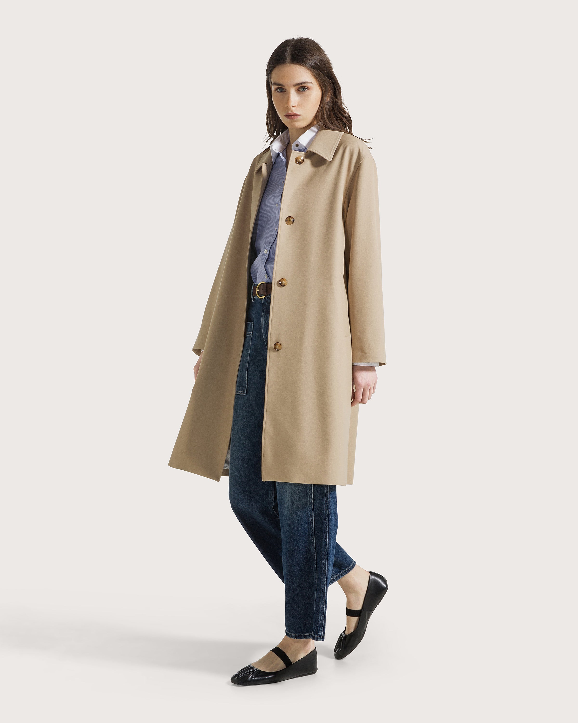 Trench lungo in gabardina tecnica fluida.